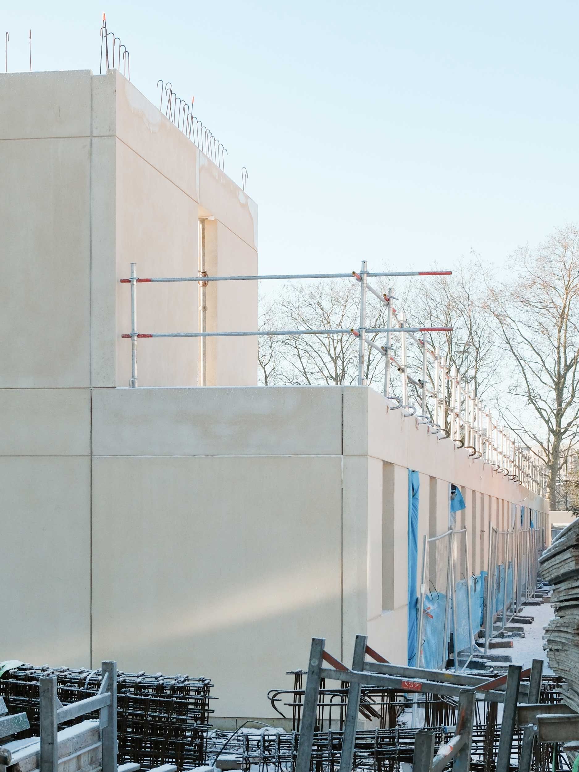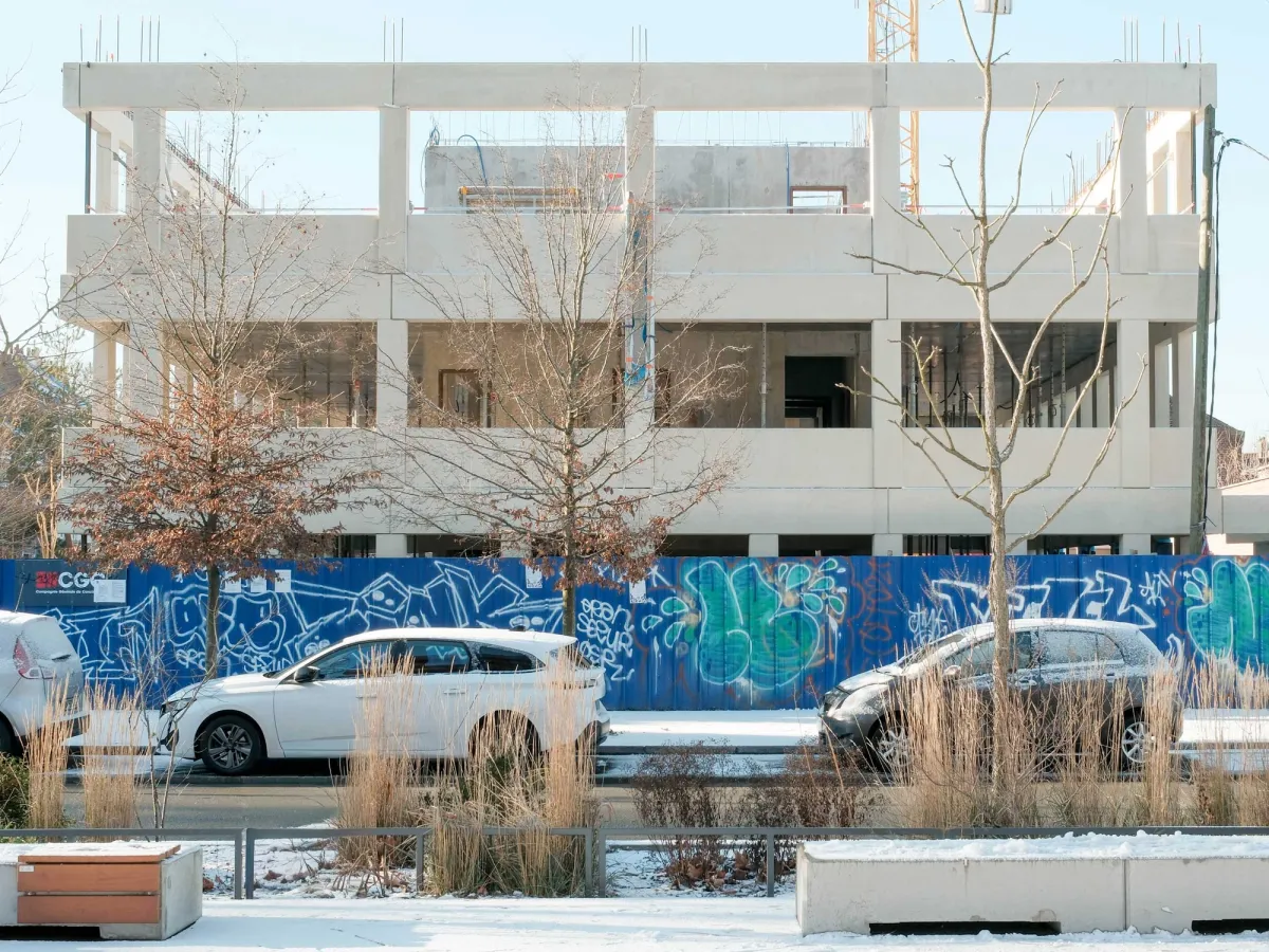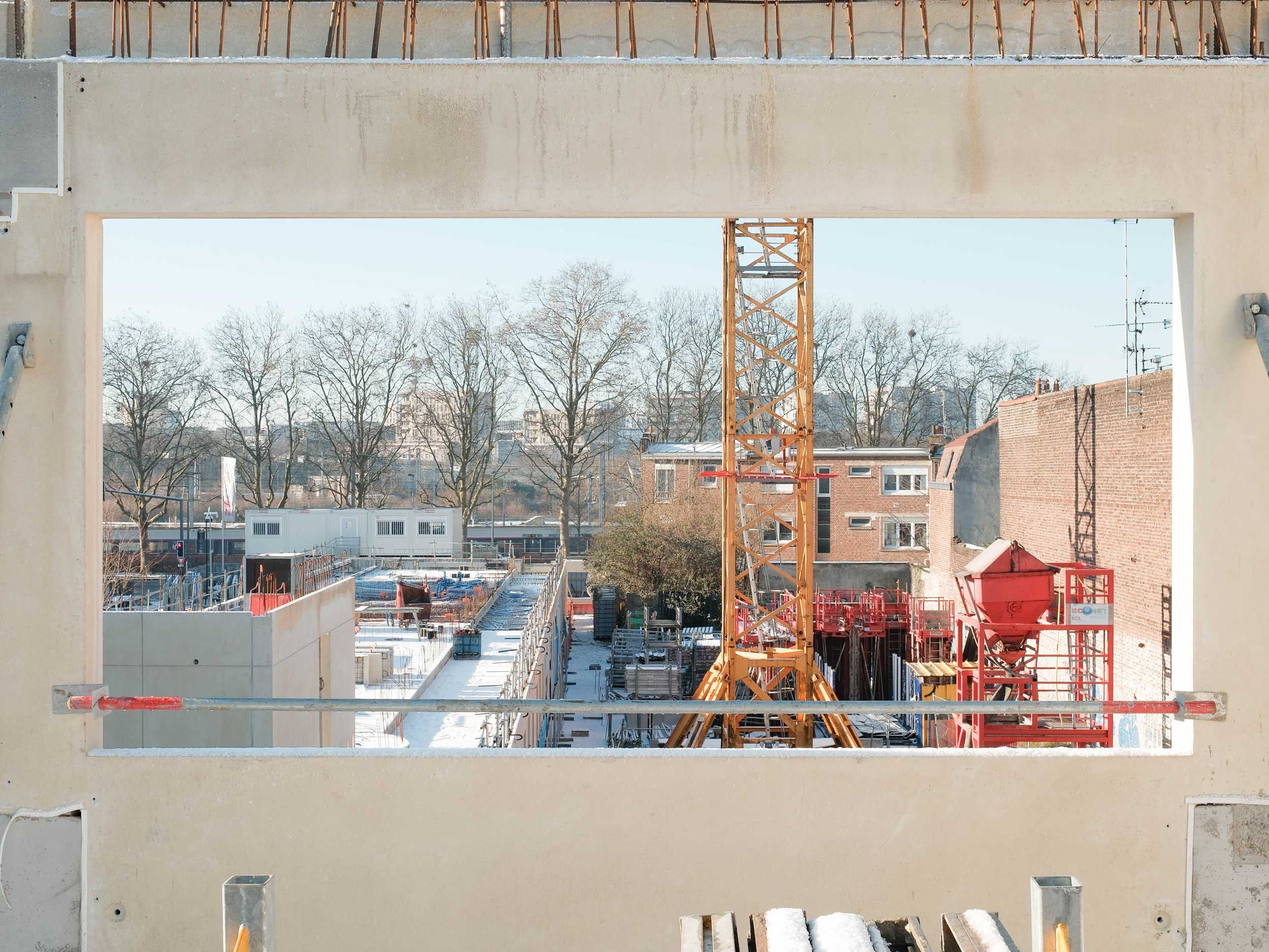 La neige tombe sur Lille et le chantier s’offre un arrêt sur image. L’exosquelette architectonique préfabriqué des logements s’érige. Déjà le rapport aux deux jardins et les premières spatialités prennent forme. Dans quelques mois, les trois bâtiments — accroche, ligne et point — finiront d’articuler la seconde entrée du quartier Fives Cail.