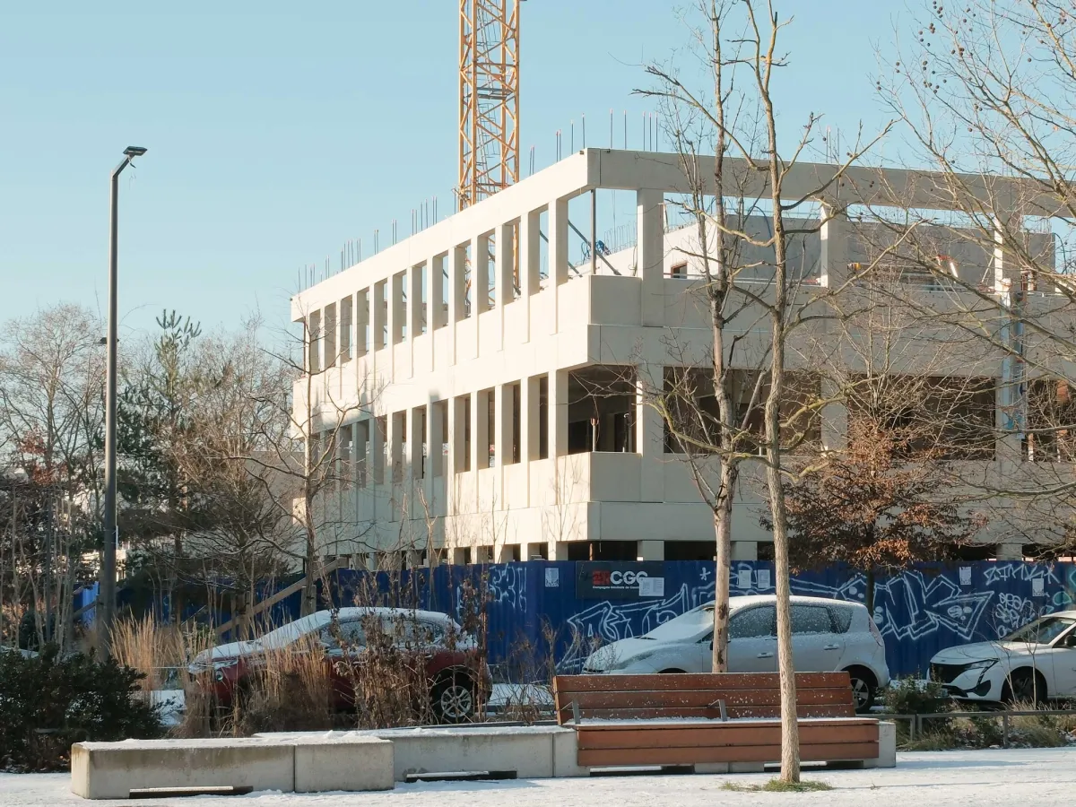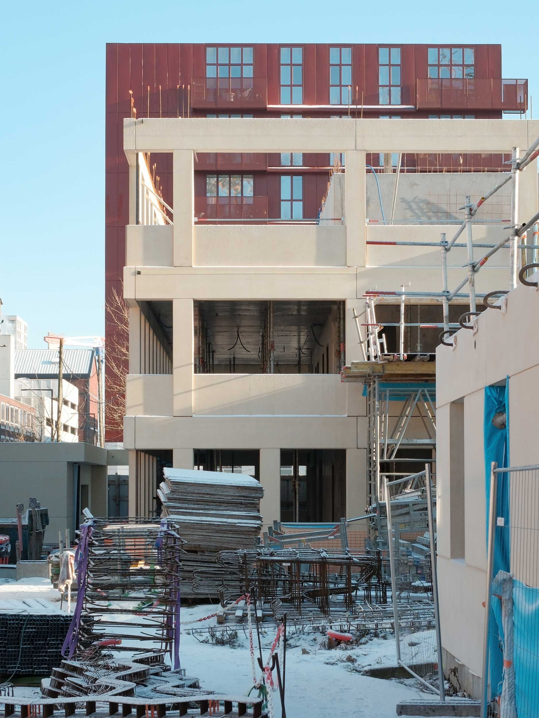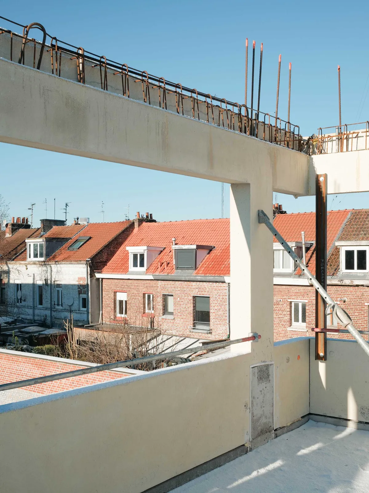 La neige tombe sur Lille et le chantier s’offre un arrêt sur image. L’exosquelette architectonique préfabriqué des logements s’érige. Déjà le rapport aux deux jardins et les premières spatialités prennent forme. Dans quelques mois, les trois bâtiments — accroche, ligne et point — finiront d’articuler la seconde entrée du quartier Fives Cail.