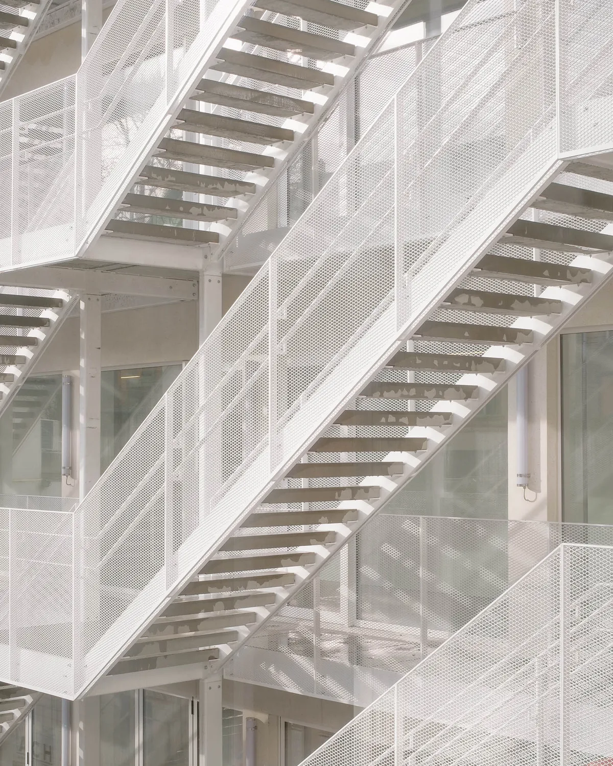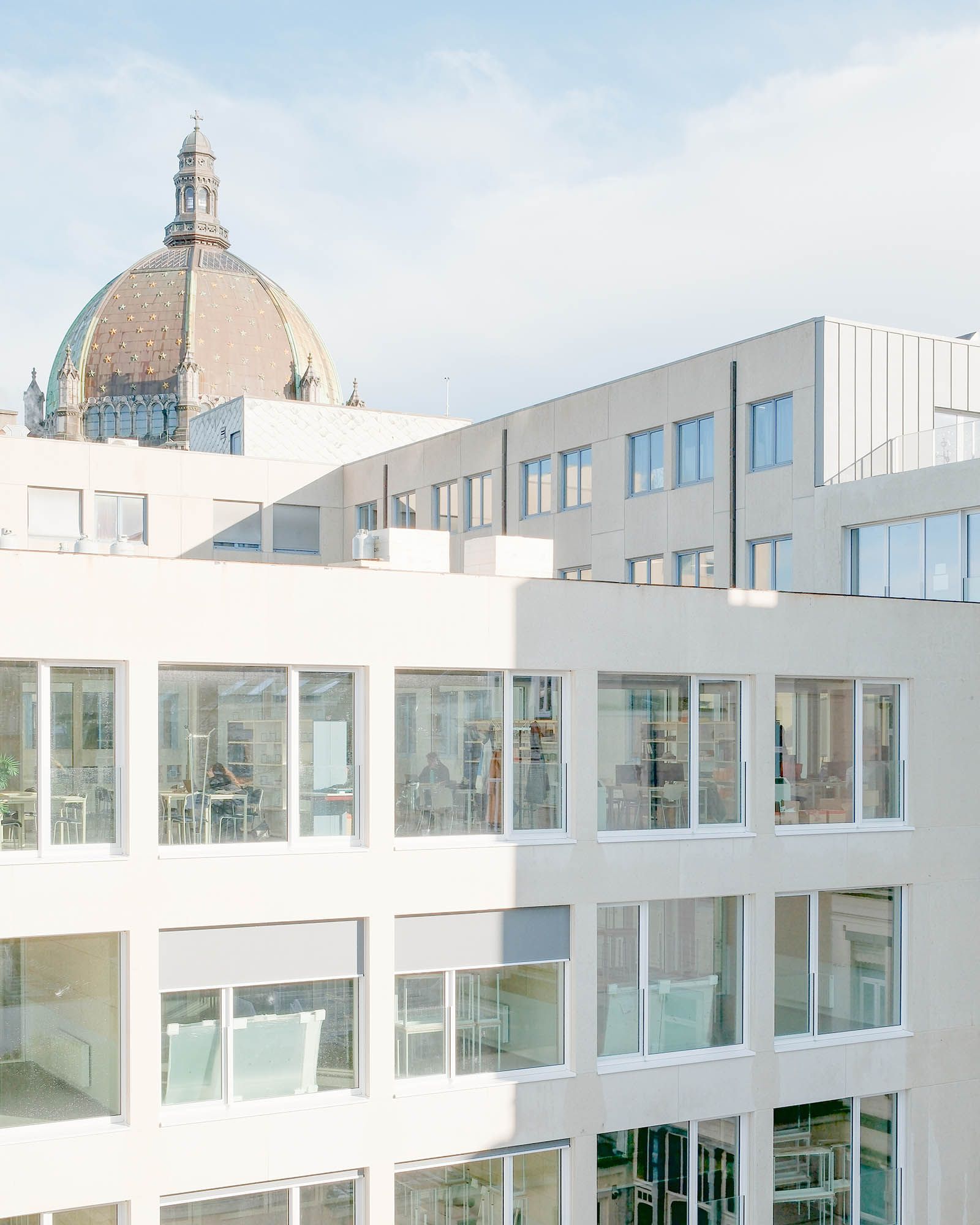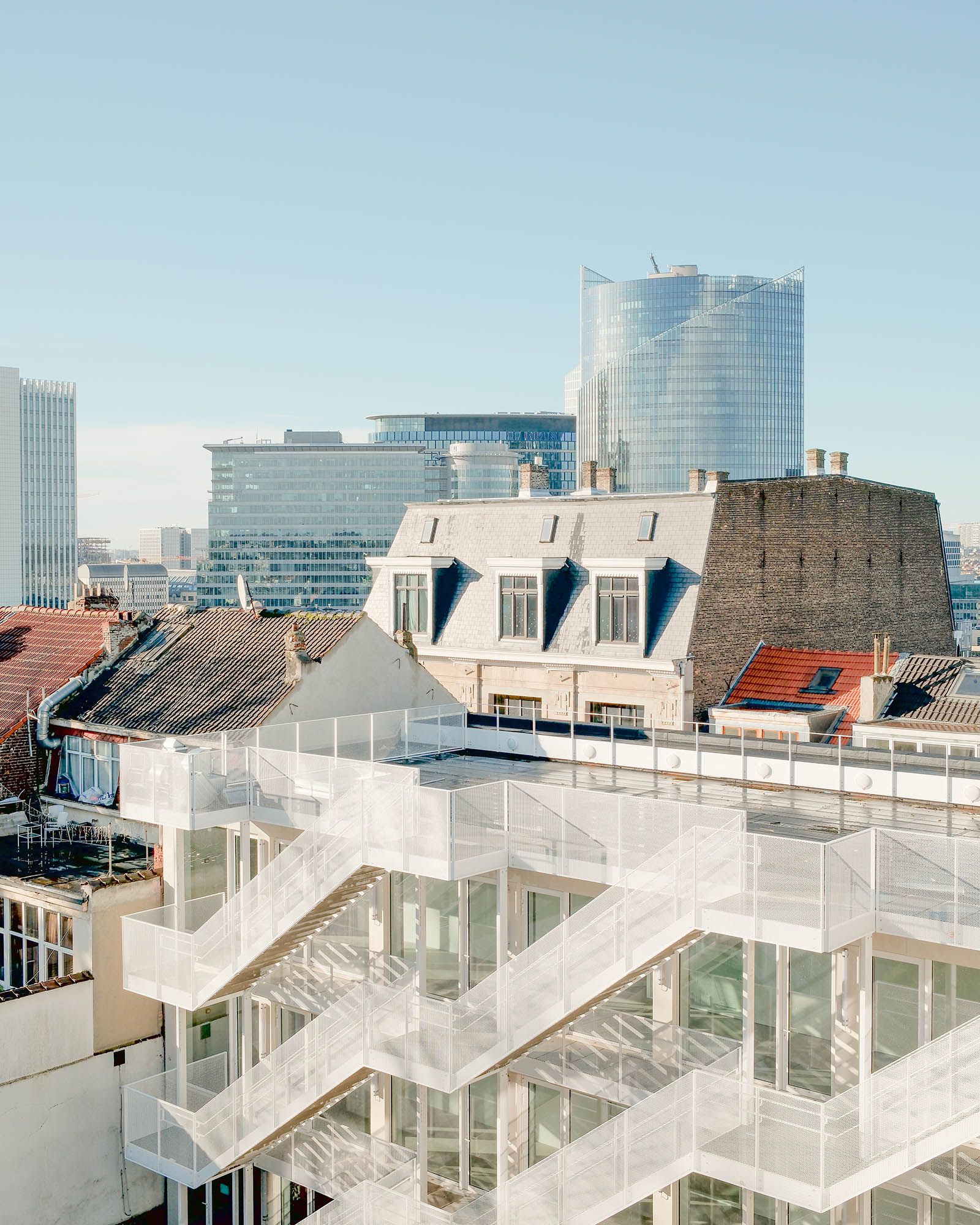 Le chantier de restructuration et d’extension de la Haute École Galileo à Schaerbeek entre dans sa dernière phase de travaux : les deux édifices patrimoniaux sont rénovés et l’extension prête à être investie par les élèves, qui pourront profiter du paysage environnant depuis un belvédère accessible par des circulations extérieures.