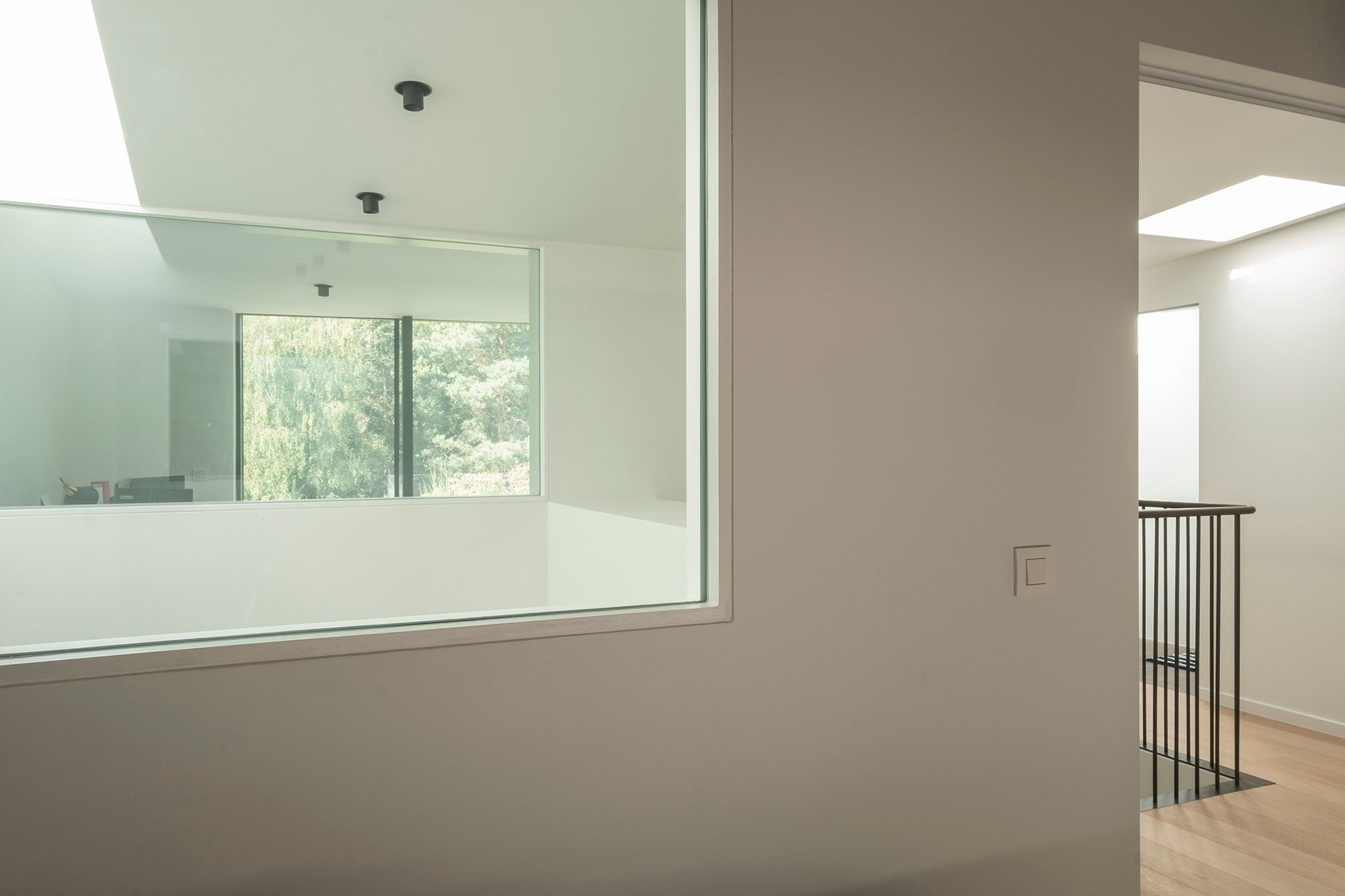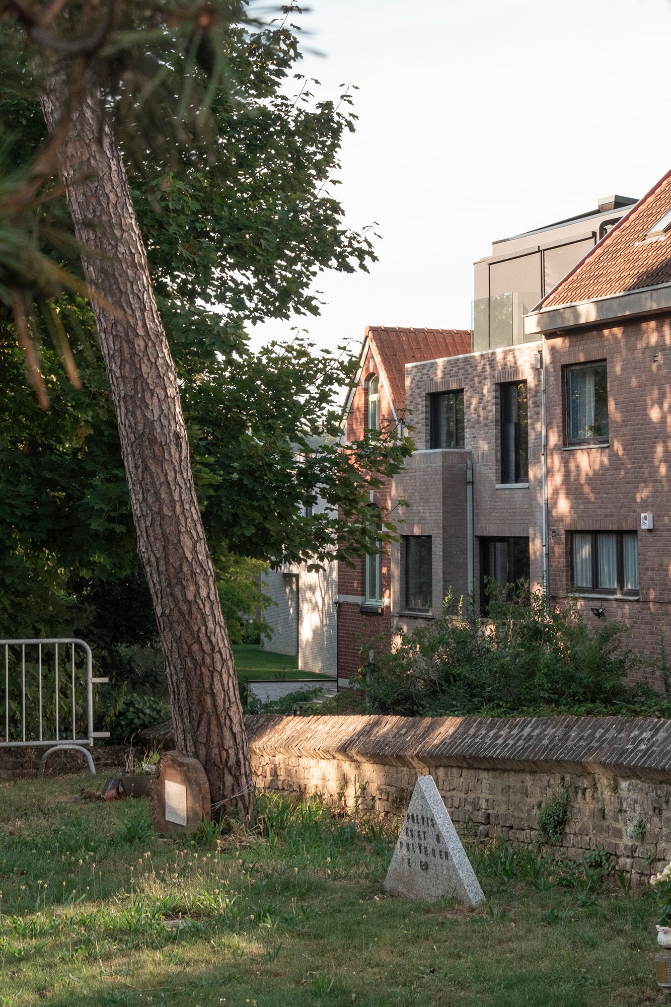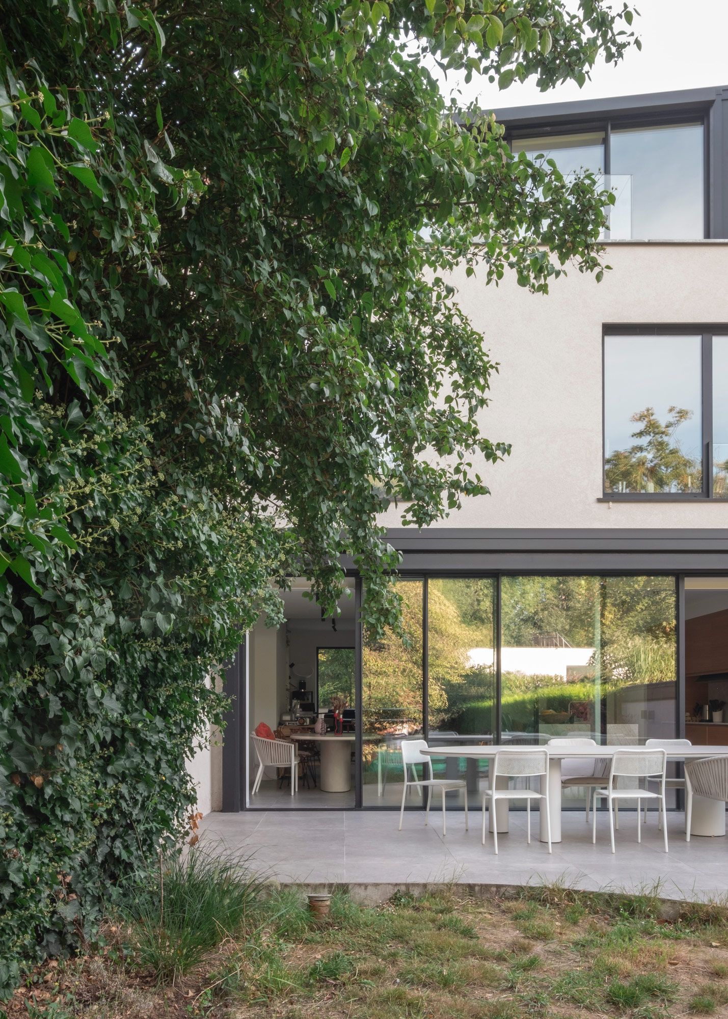 D’abord horizontalement, entre le jardin et le cimitière désaffecté du Dieweg, dont les grands chênes surplomblent la rue du Repos. Ensuite verticalement, le vide de l’escalier existant est prolongé sur deux étages, générant un lieu vertical qui connecte les différents de lieux de la maison, et laisse la lumière pénétrer l’édifice de haut en bas.