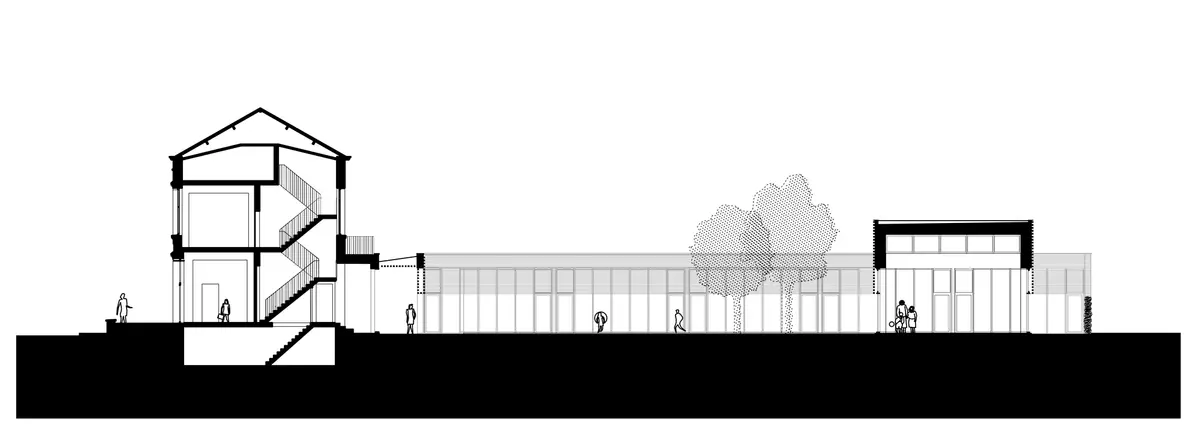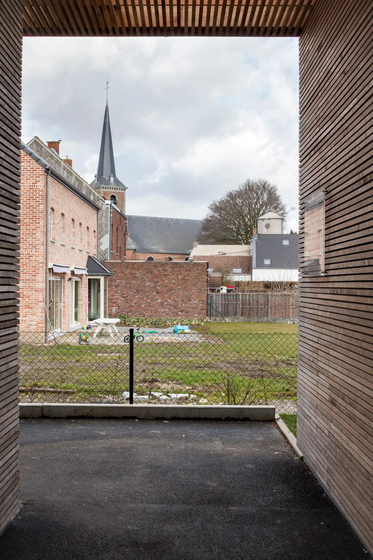 Le projet se veut être un équipement flexible intégré dans la structure urbaine et paysagère qu’est le village de Thieusies. Fort de la lecture des lieux et de la nécessité de maintenir un espace de cour généreux l’extension prend place au plus près des bords.