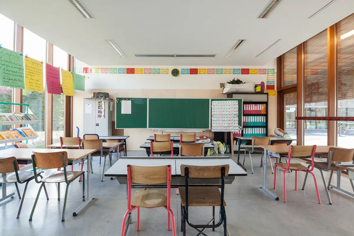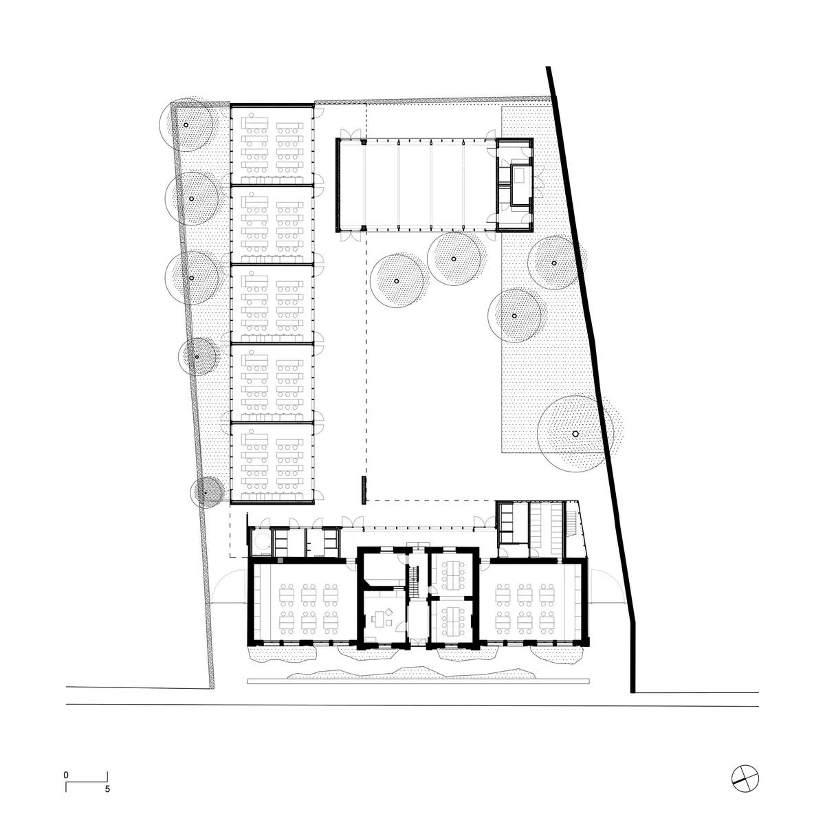 Les cinq nouvelles classes primaires sont installées sur le flan nord du site. Elles seront ainsi en regard du centre du village et éclairée par une lumière nord généreuse. Elles sont également articulées à la cour et éclairées indirectement au sud par l’intermédiaire du préau. Enfin, ces classes s’articulent à un espace extérieur tranquille que nous imaginons traiter comme un jardin.