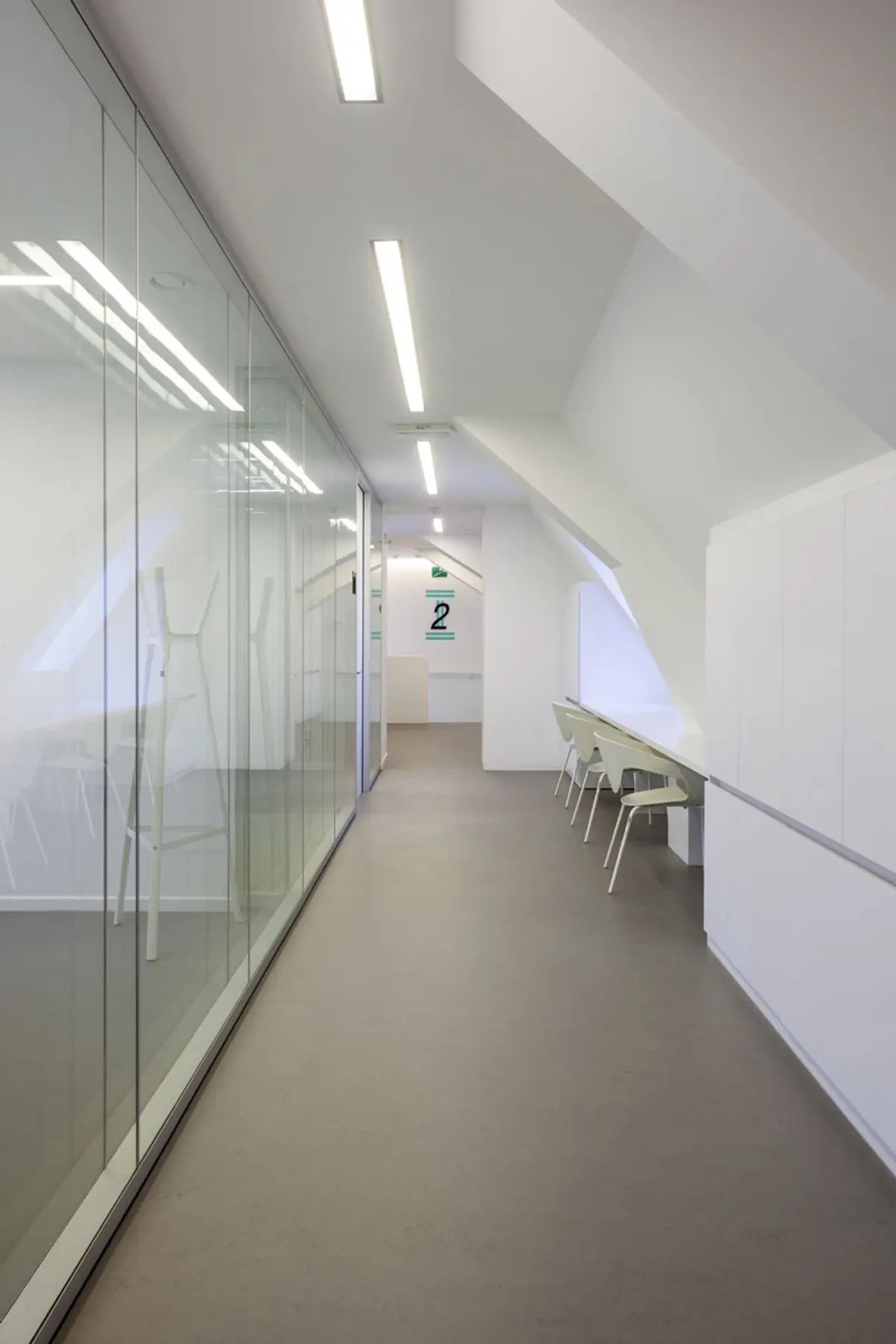 Le projet regroupe un accueil, une administration d’aide aux jeunes créateurs, des spaces partagés (exposition, réunions, coworking, cafétéria) et cinq unités de travail individuelles, créant un environnement collaboratif en rapport avec l' extension.