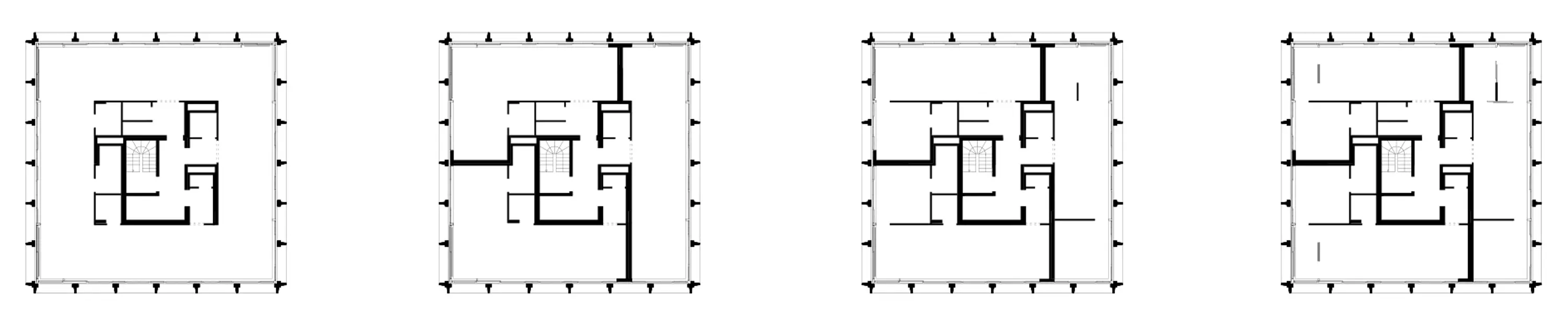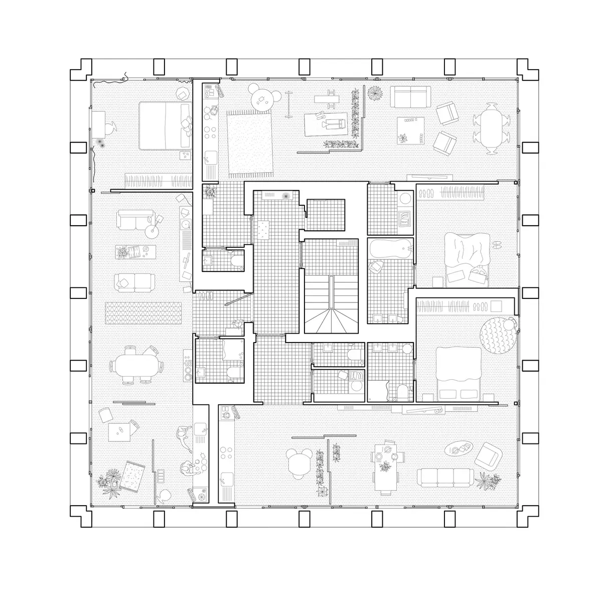Le projet s'organise en couches constructives depuis le noyau central structurel autour duquel se concentrent les pièces de services. Les chambres, cuisines, pièces de vie et jardins d'hiver se trouvent tous sur la périphérie.
