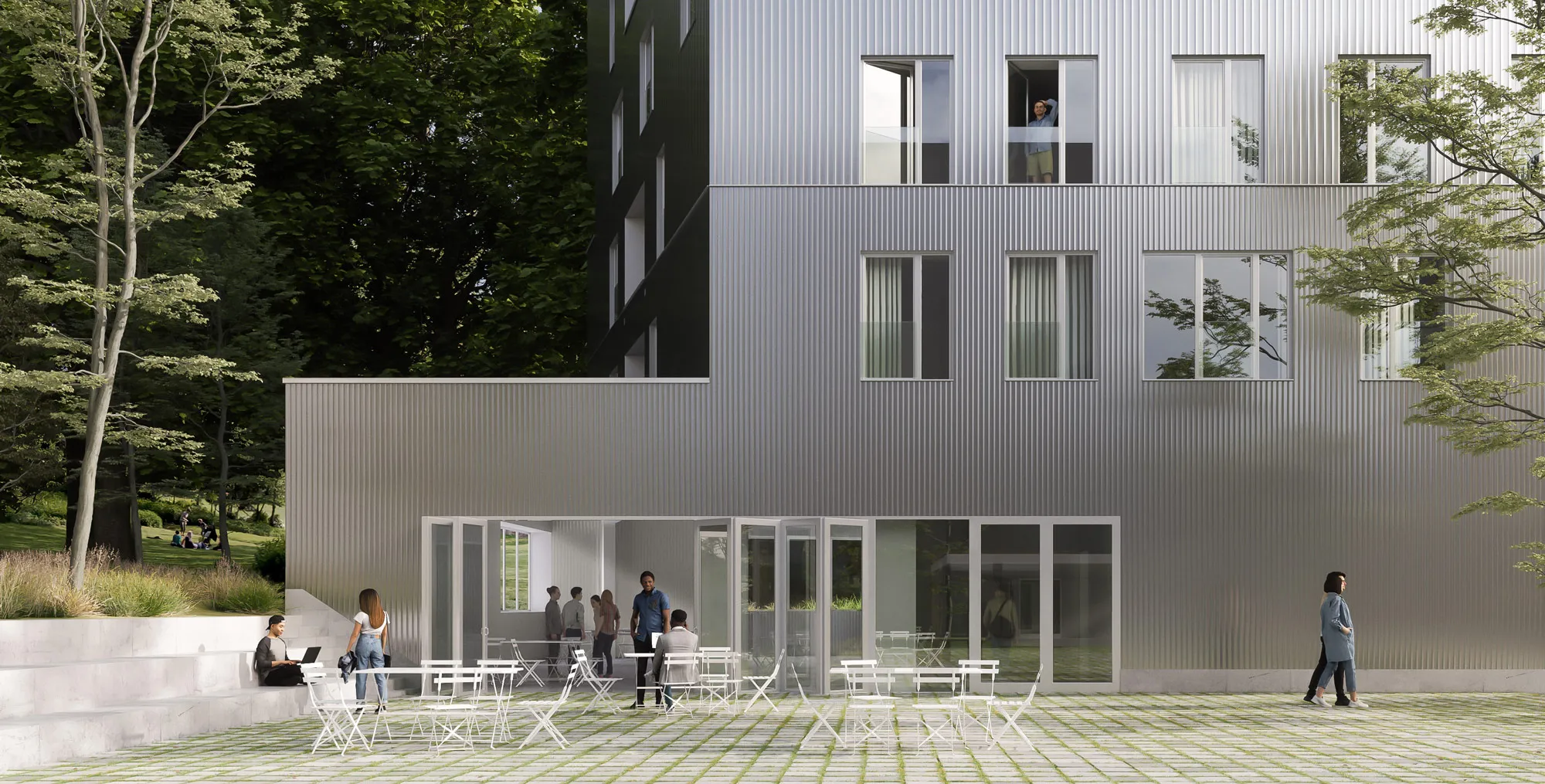 L'édifice se situe au bout de la parcelle et est condensé dans un gabarit vertical pour libérer au maximum le sol, ne pas créer de vis-à-vis avec les logements mono-orientés existants sur le site et créer une articulation vers le nouveau MediaPark.
