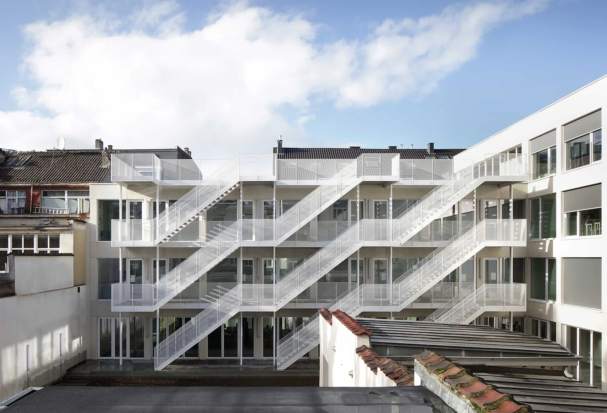 L’extension proposée est bipartie. Une première aile comble la dent creuse, créant ainsi une nouvelle adresse à l’école. La seconde aile relie la rue Royale à la rue de la Poste. Le positionnement du learning center et de la cafétéria au rez-de-chaussée permet d’ouvrir largement l’école sur ces espaces publics. Le campus s’intègre dans l’urbain.
