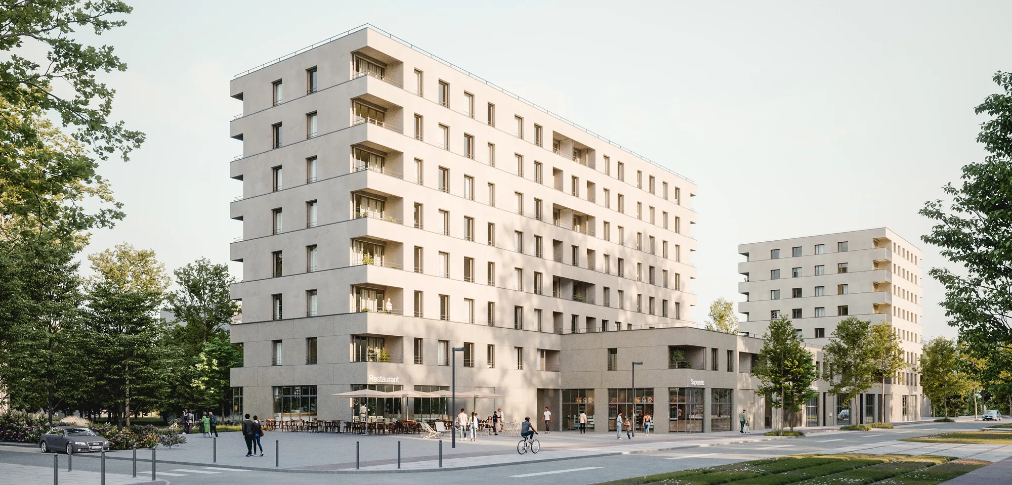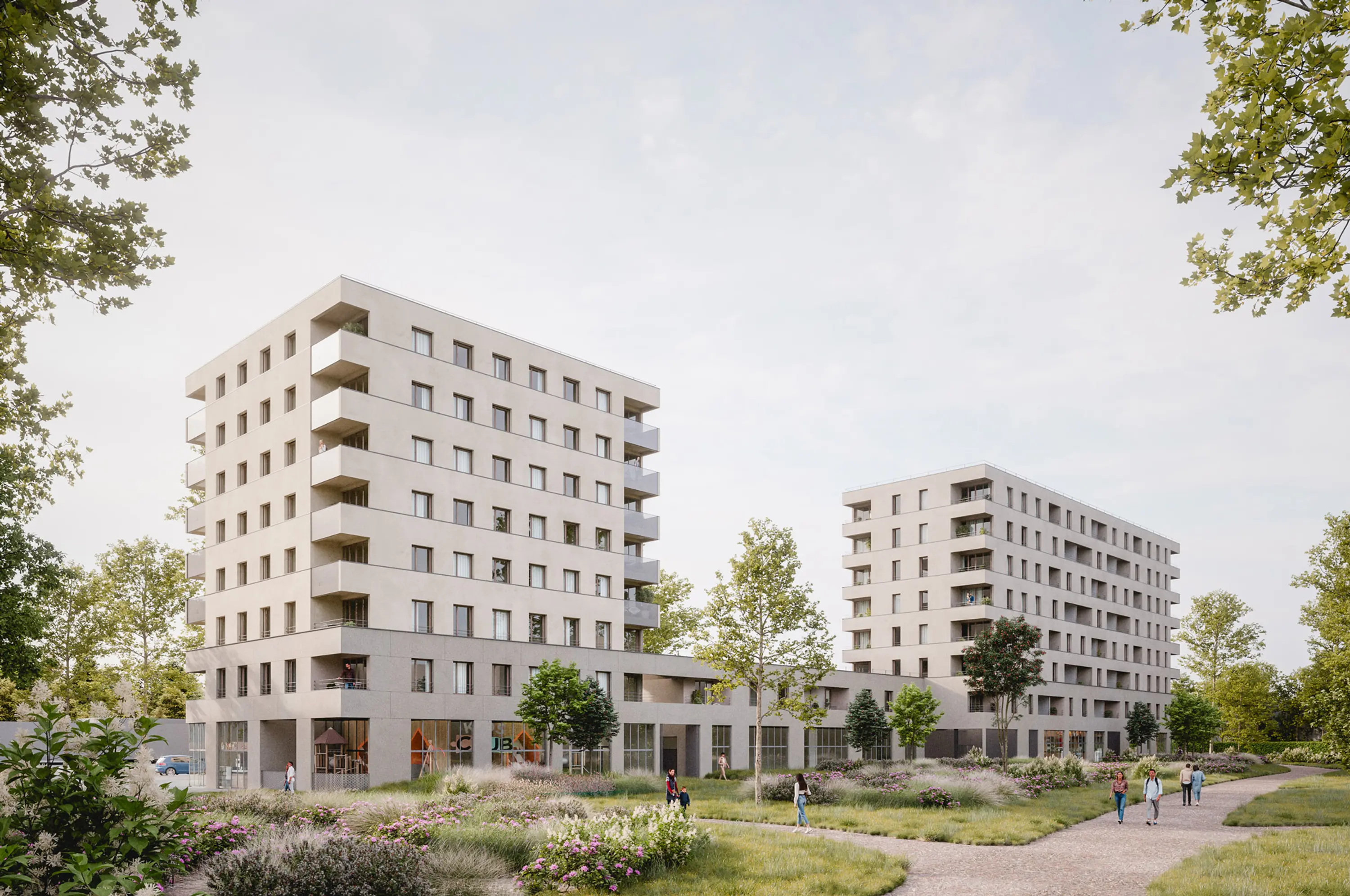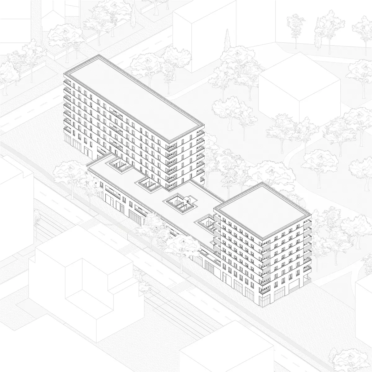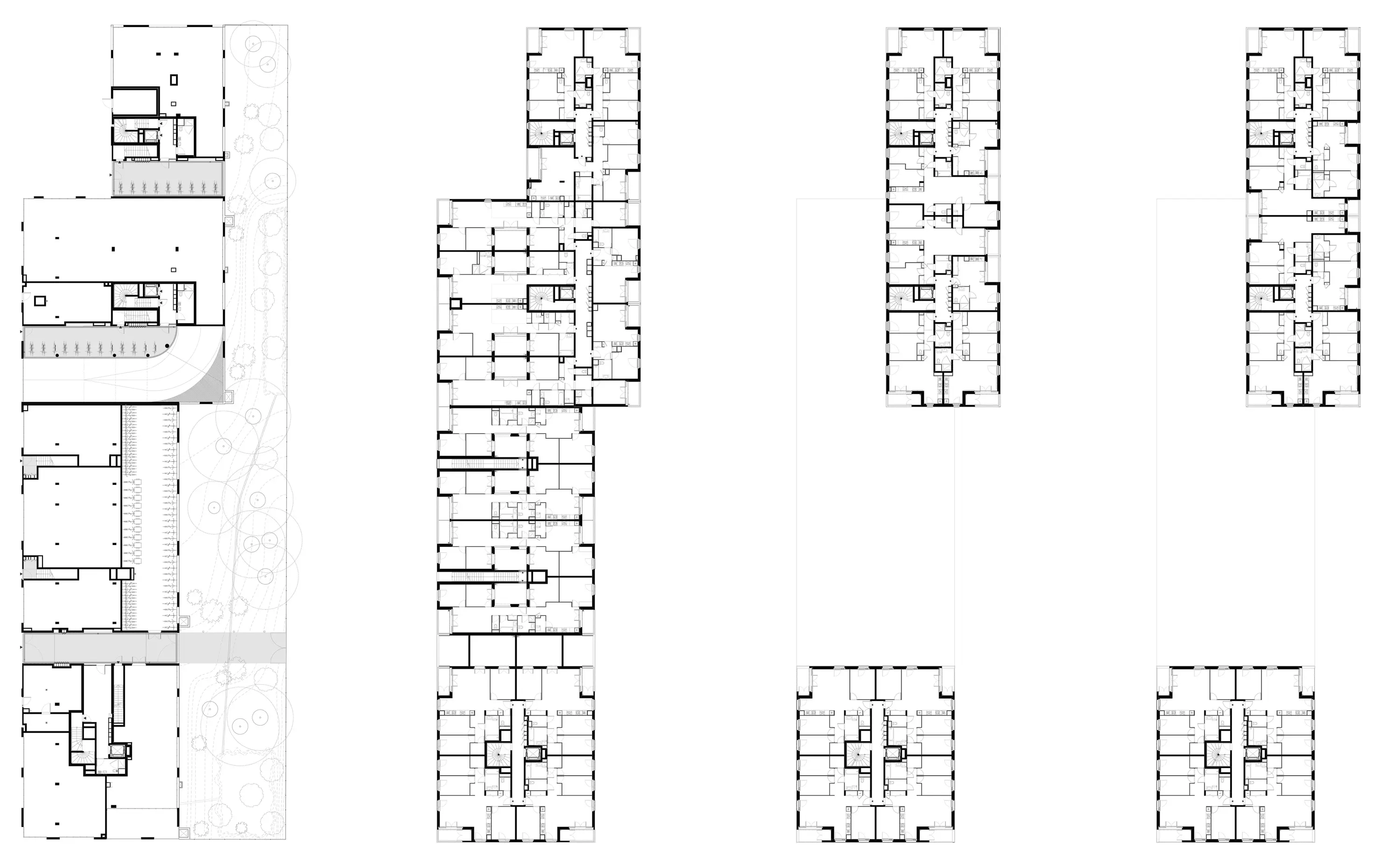 L’édifice se compose d’un socle, surplombé par une barre et un plot. Le socle se déforme pour créer des espaces publics : une place qui marque l’entrée du quartier et un jardin le long du parc. L’ensemble génère une fenêtre urbaine depuis la rue de Marseille, qui laisse pénétrer les rayons de soleil du soir, dans l’espace vert.