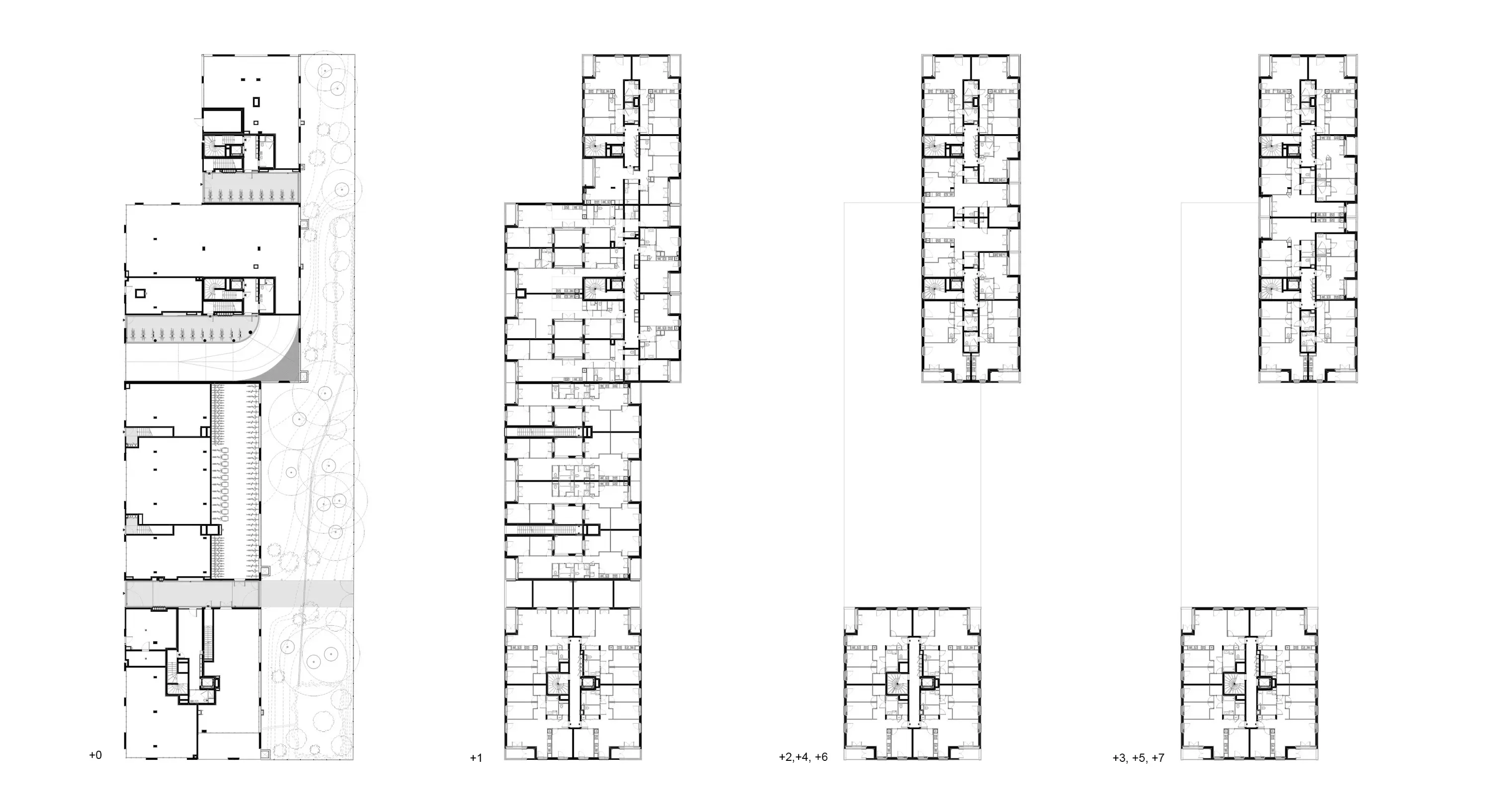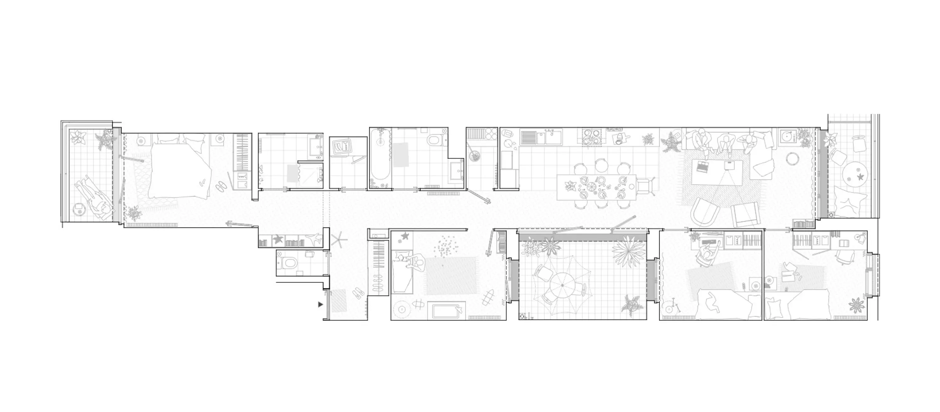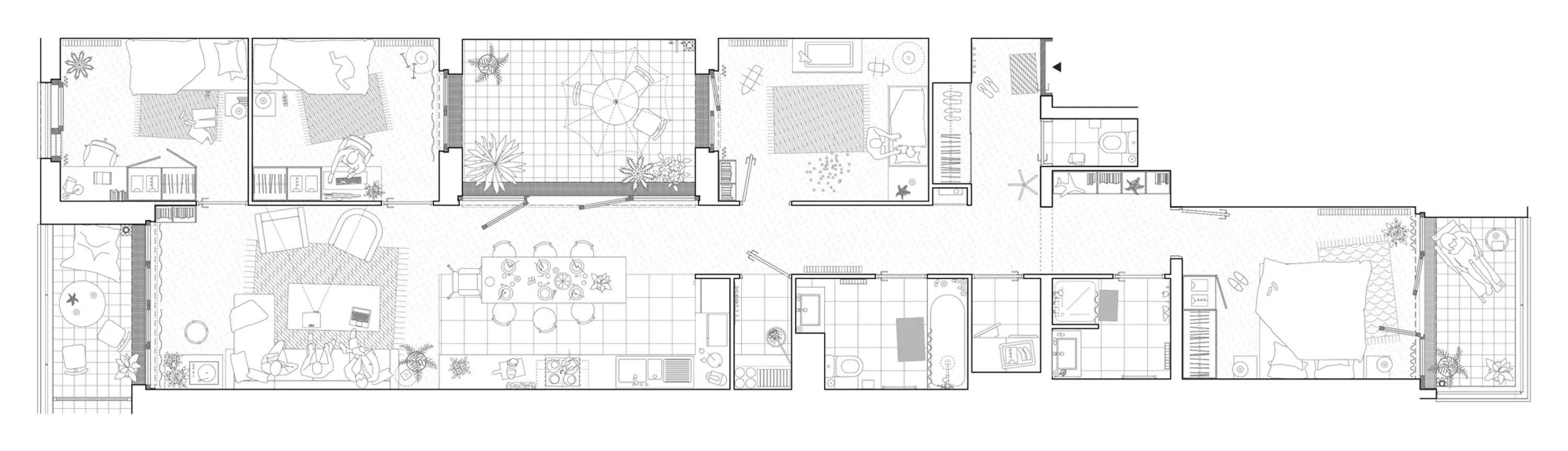 Au premier étage, une série de logements compris dans le socle présentent une profondeur inhabituelle (de 20 à 25m). Tendus entre deux terrasses, ils s’articulent autour d’un patio.