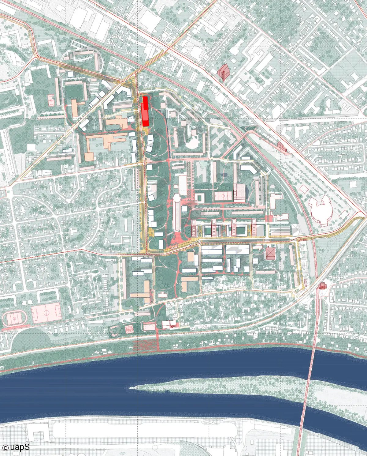 Cet édifice de logements sociaux constitue la tête de proue d’une vaste opération de reconfiguration urbaine, à Orgemont. Il s’implante entre une avenue et un nouveau parc de plusieurs kilomètres de long, qui a vocation de relier le quartier à la Senne.