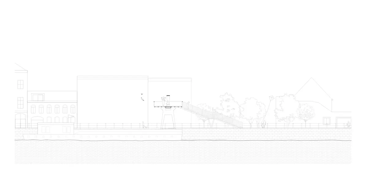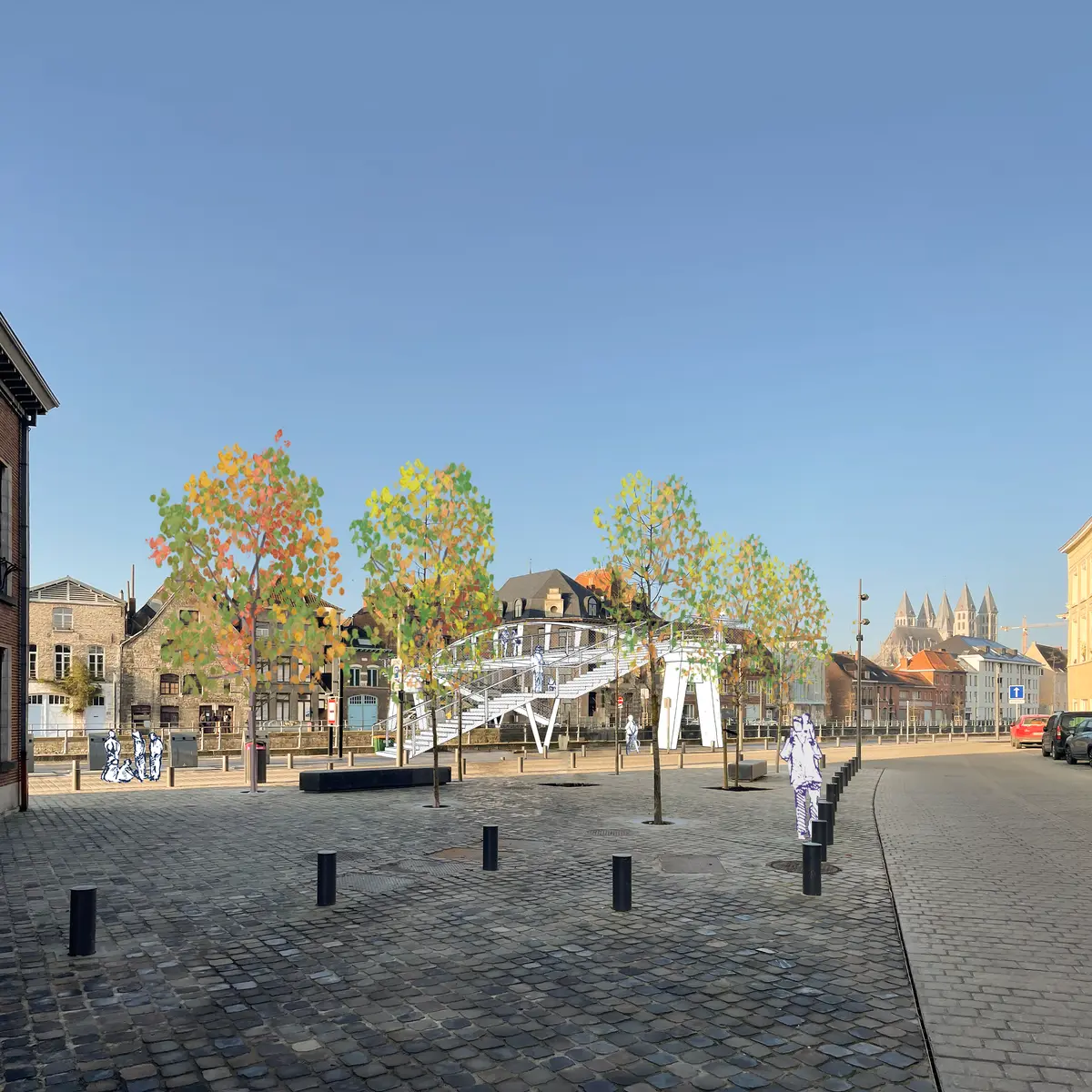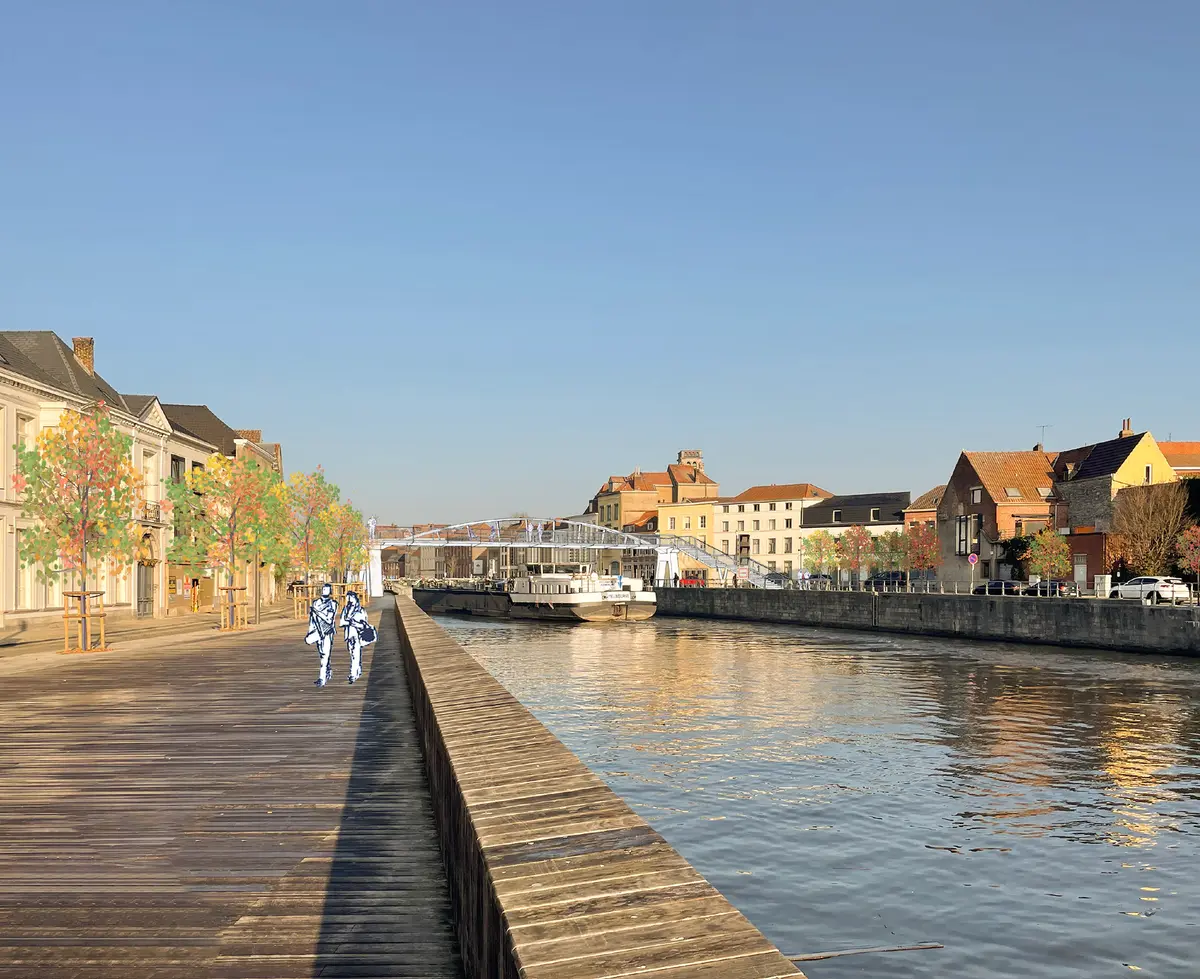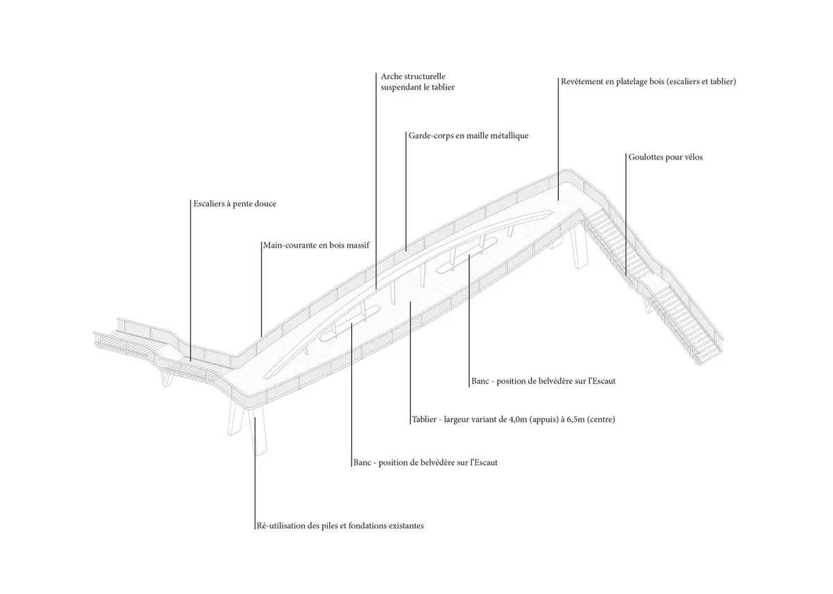 La passerelle s’élargit pour doter l’espace d’une qualité inédite à Tournai, celle d’un espace public à part entière au-dessus de l’eau qui permet de se ‘pauser’ sereinement dans la plus grande dimension de la ville, dans la longueur de l’Escaut et de ses quais récemment reconfigurés et rénovés. Elle permet d’assister, entre autres évènements, au passage de ces grandes péniches qui instituent davantage la ville de Tournai entre la Seine et les grands ports du Nord.