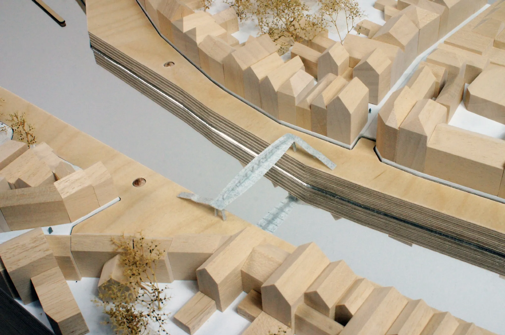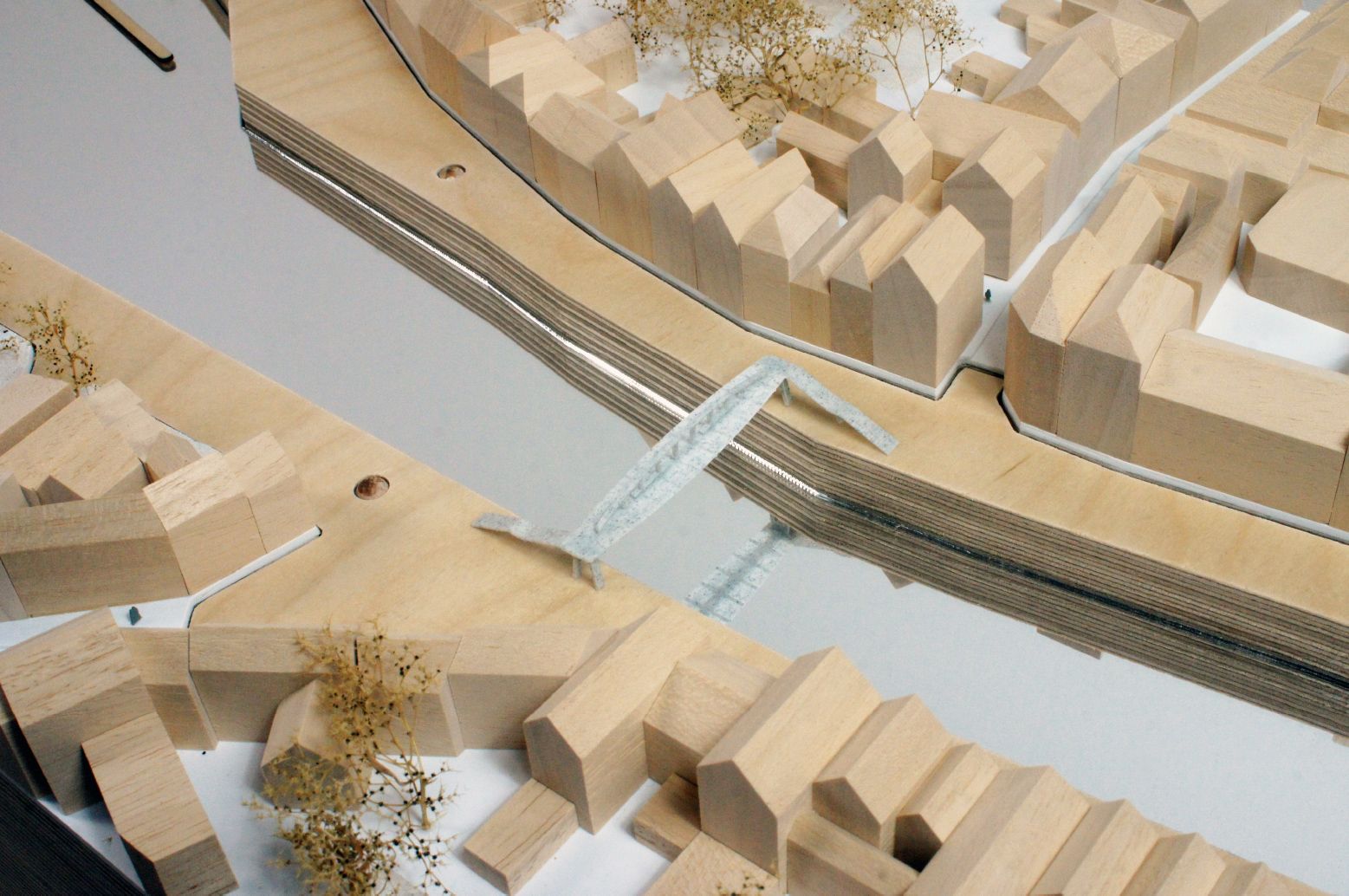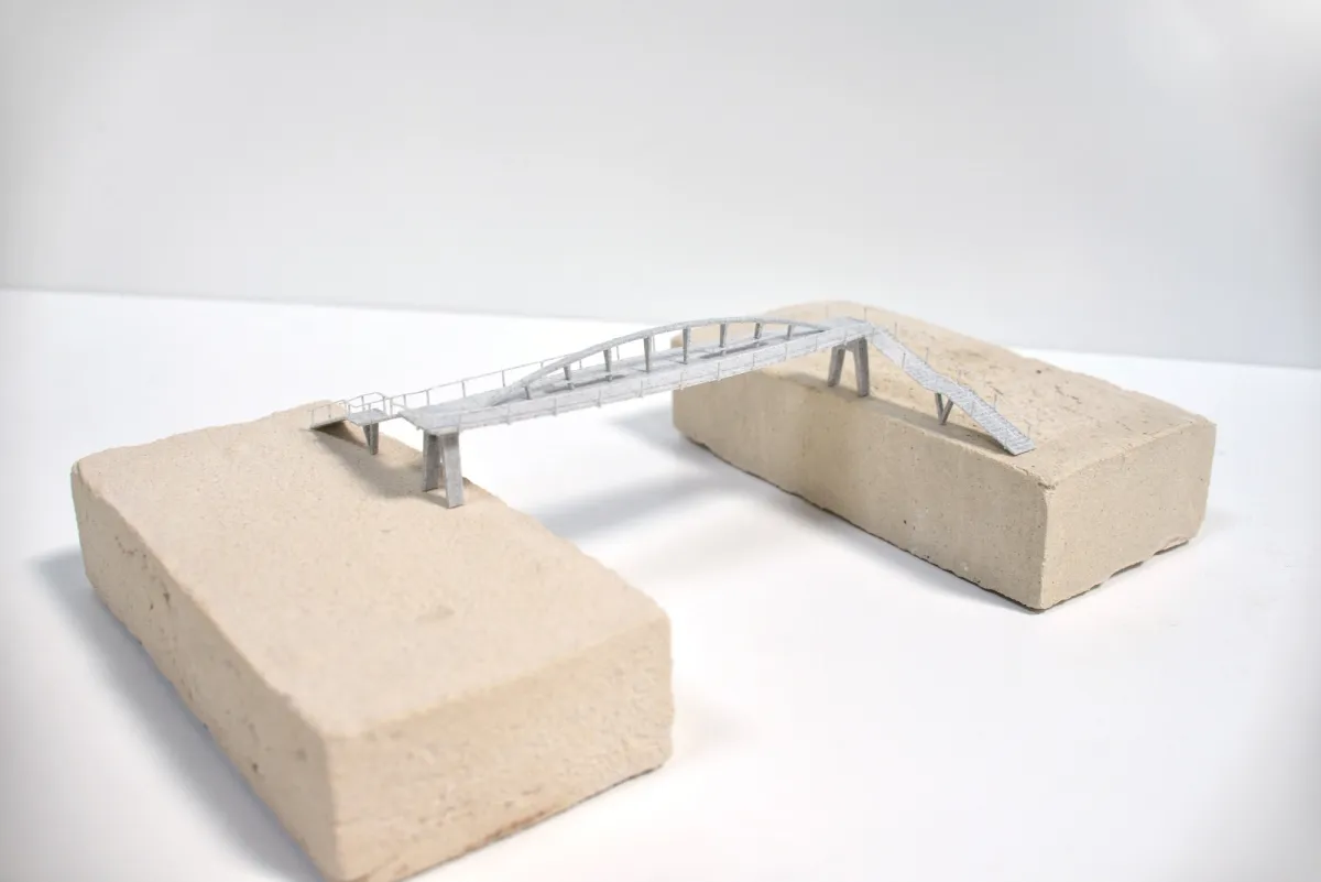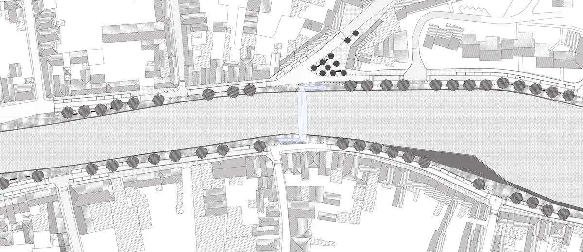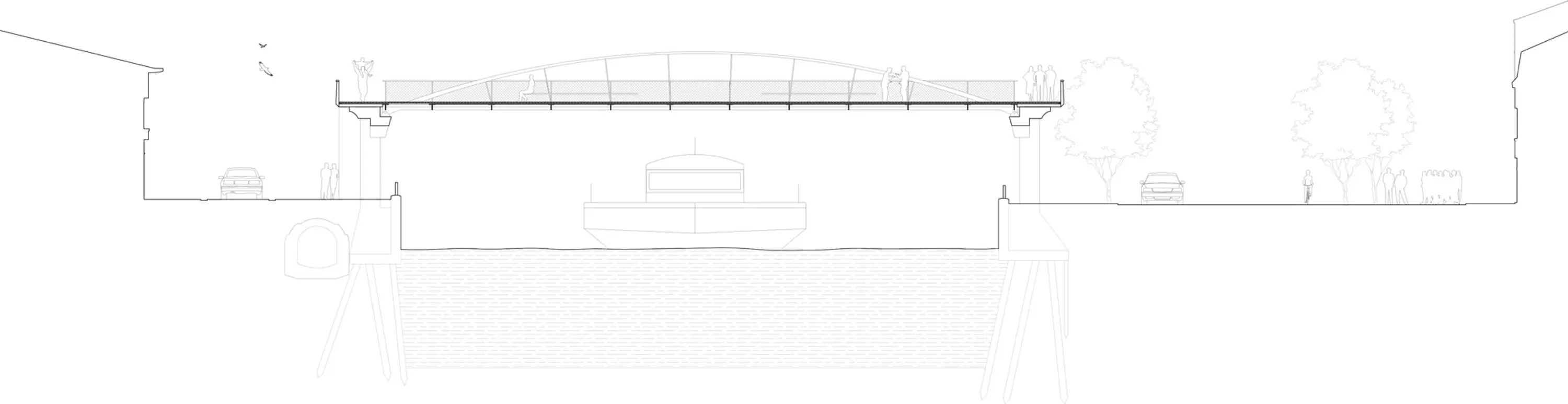 La lecture urbaine et constructive propose de maintenir l'emplacement de la passerelle actuelle, et de réutiliser ses piles et fondations pour supporter une nouvelle passerelle qui serait suspendue par une arche, permettant d'atteindre la contrainte de hauteur navigable requise en ré-utilisant les éléments existants.En cumulant la circularité matérielle à la rationalité urbaine et constructive, notre proposition pour la traversée de la passerelle de l’Arche s’inscrit dans les enjeux contemporains d’éthique environnementale et sociétale. Elle économise énormément de moyens pour les mettre au service de la nature même de l’ouvrage d’art proposé.