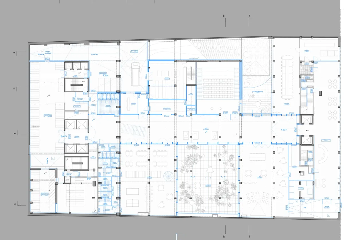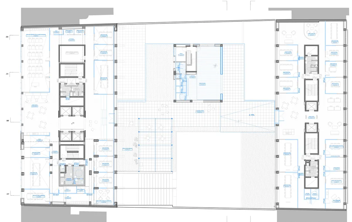 Pour les étages de bureaux, il s’agit de conserver les structures portantes actuelles et de valoriser le caractère de « grands plateaux » en retirant ou déplaçant certains cloisonnements afin :