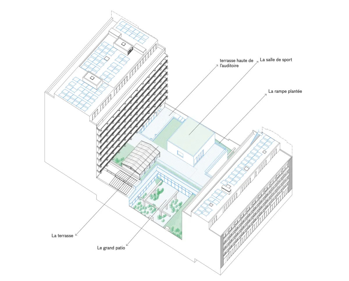 - d’adjoindre les programmes communs, aux bords et aux abouts de cette galerie. Ces lieux extérieurs et intérieurs ont une identité spatiale forte : jardin, patios, cafétéria, auditoire, HUB, salle d’exposition, etc… Ils sont traités comme des « pièces architecturales » trouvant place dans la figure générale proposée.
