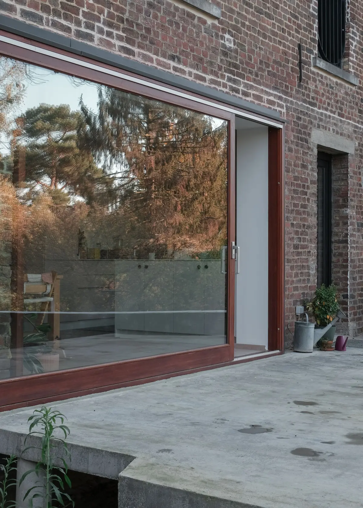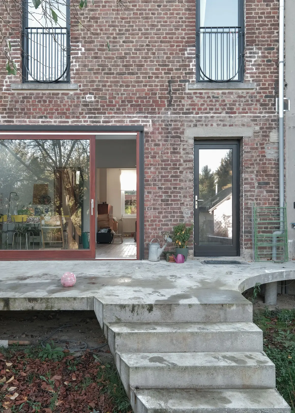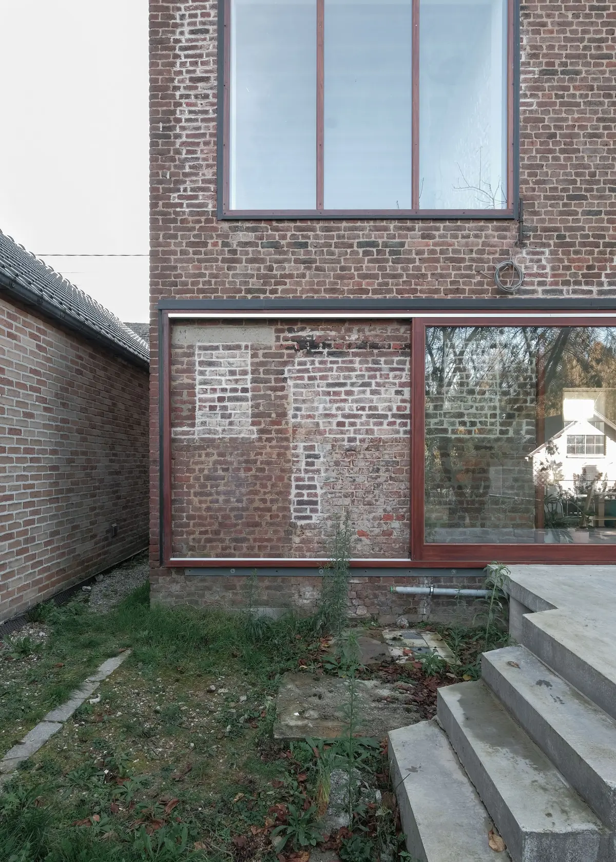 VILLERS est une intervention locale et low-tech privilégiant des choix architecturaux plutôt que des choix techniques. L’idée du «As-found» a guidé la conception et permis de valoriser les forces déjà présentes de la bâtisse. Cette dernière a été considérée comme un corps, que l’on accompagne dans une transformation organique qui s’opère au fil des années, depuis le début du XXème siècle. La façade et l’intérieur est transformé, les briques sont extraites des murs porteurs, déplacées et remaçonnées à d’autres endroits de la maison. Un palimpseste de cicatrices se dessine sur la façade, témoignant de ces temporalités et époques. La rénovation privilégie des matériaux durables et locaux. De nombreux éléments de la maison, tels que les portes, les sols et d’autres détails ont été démontés et réutilisés, ou fournis par Rotor et d’autres entreprises de récupération du réseau Opalis.