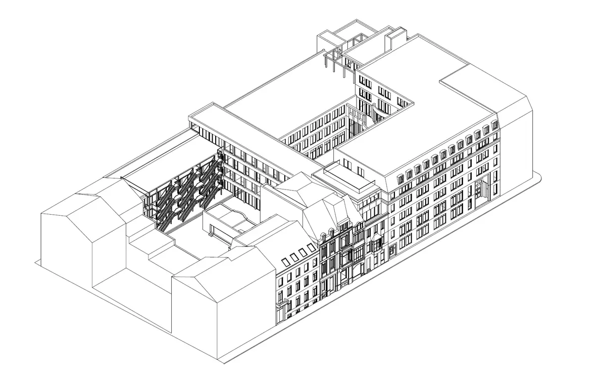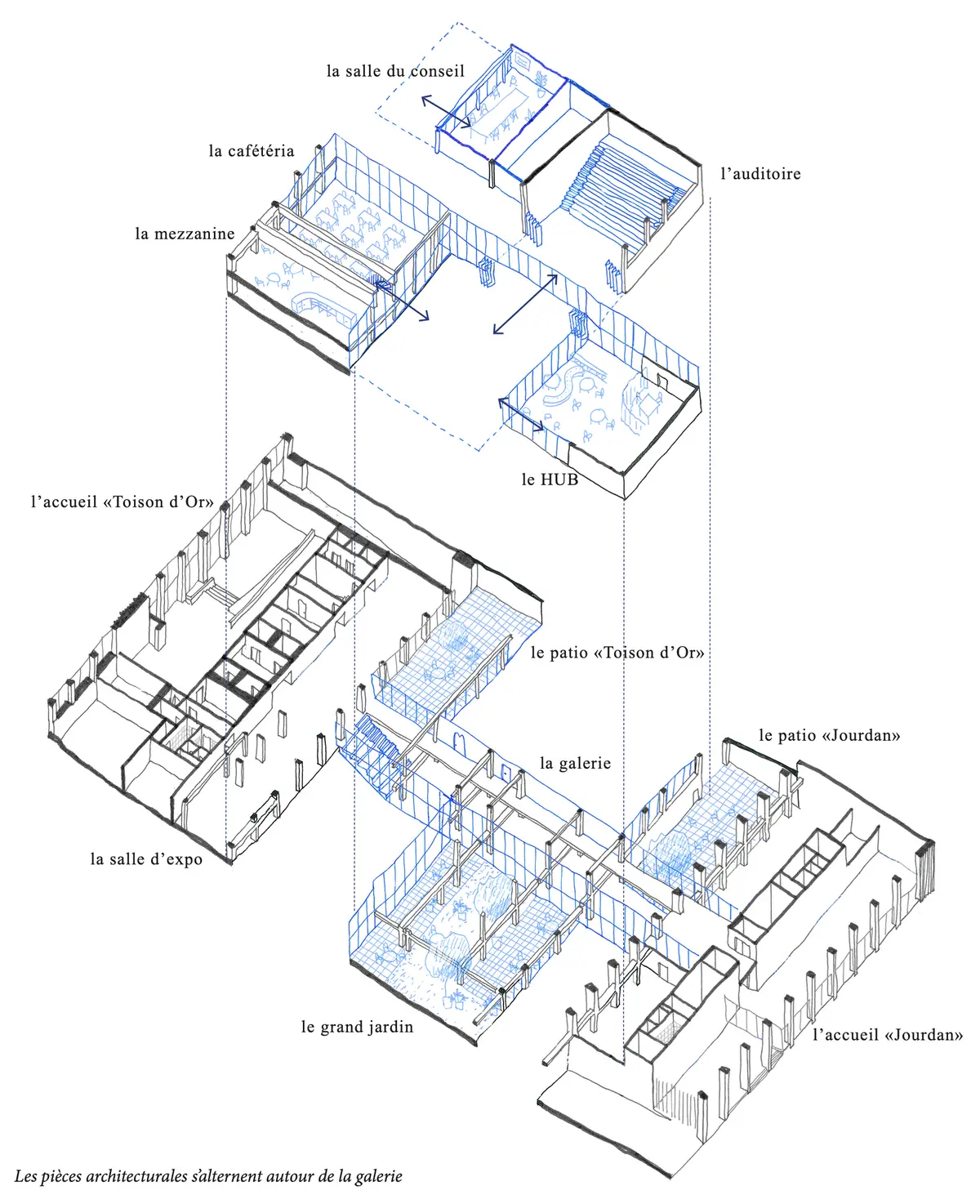 Une grande galerie traverse la parcelle et relie deux édifices et plus loin, deux quartiers. Elle se façonne par ses bords : une alternance de cours et jardins qui lui apportent air et lumière, et une série de pièces aux programmes variés.