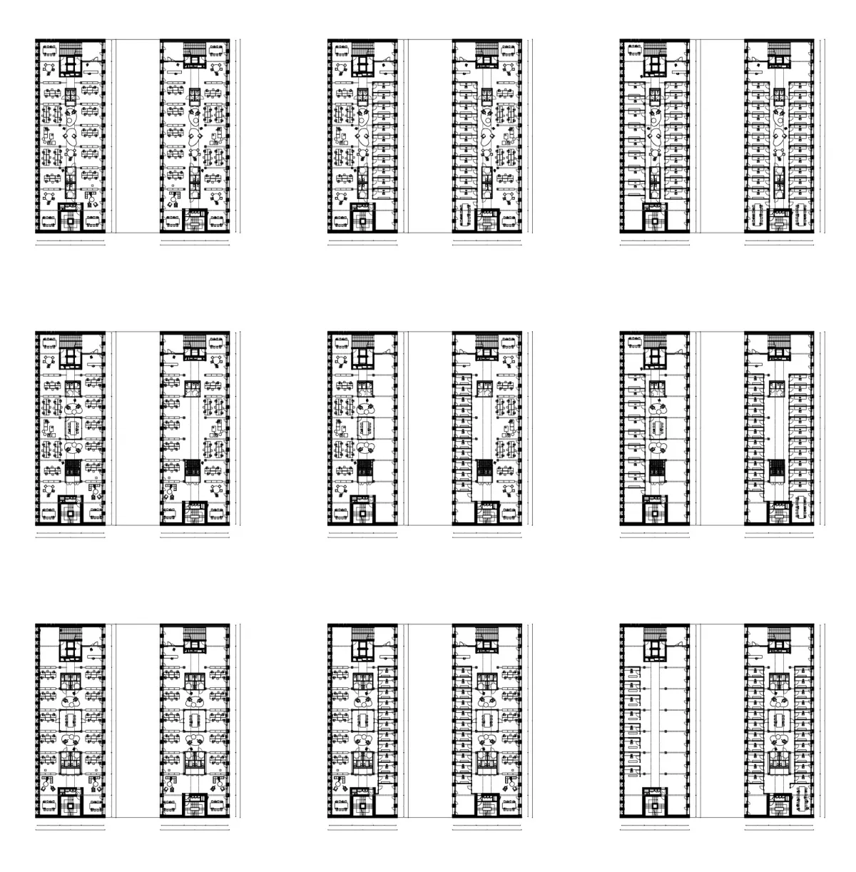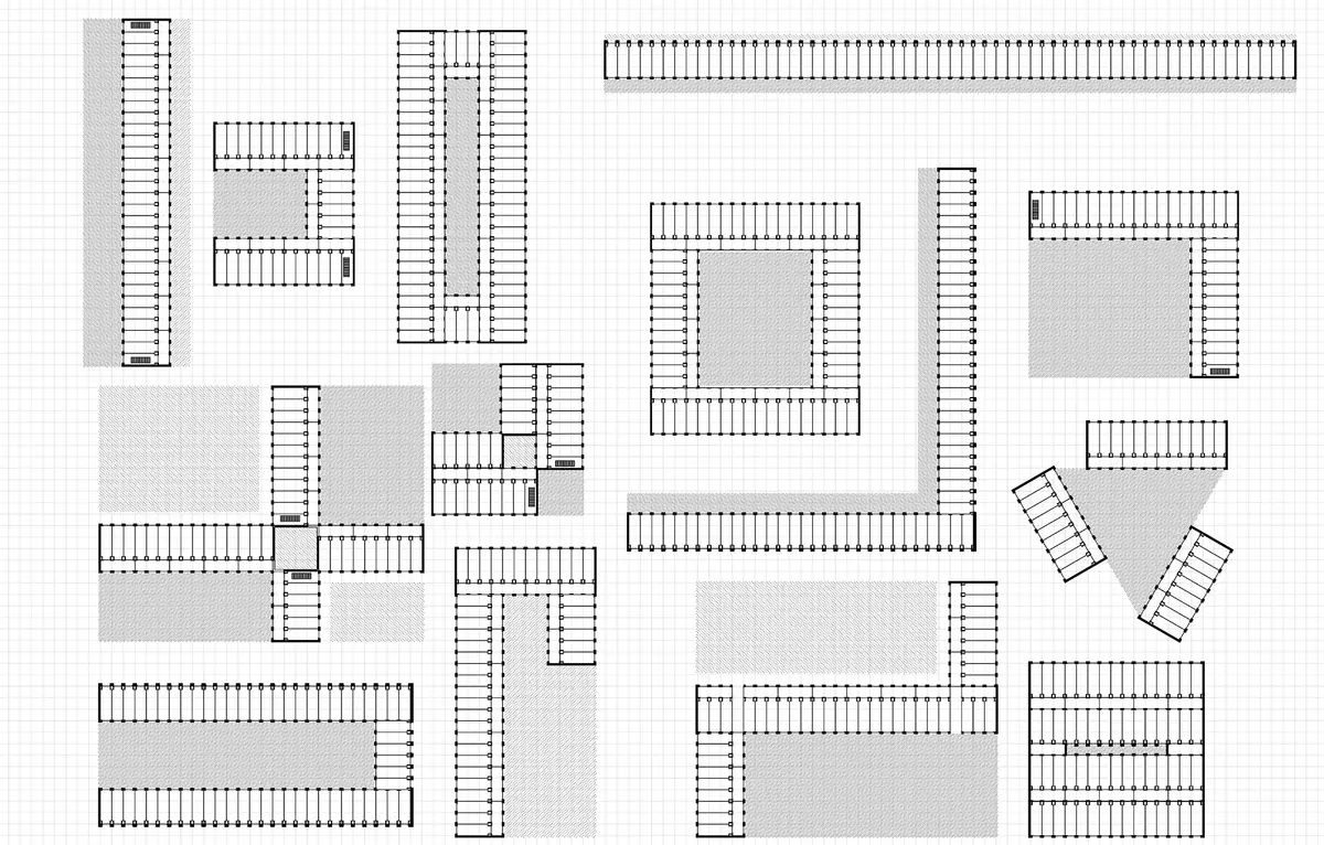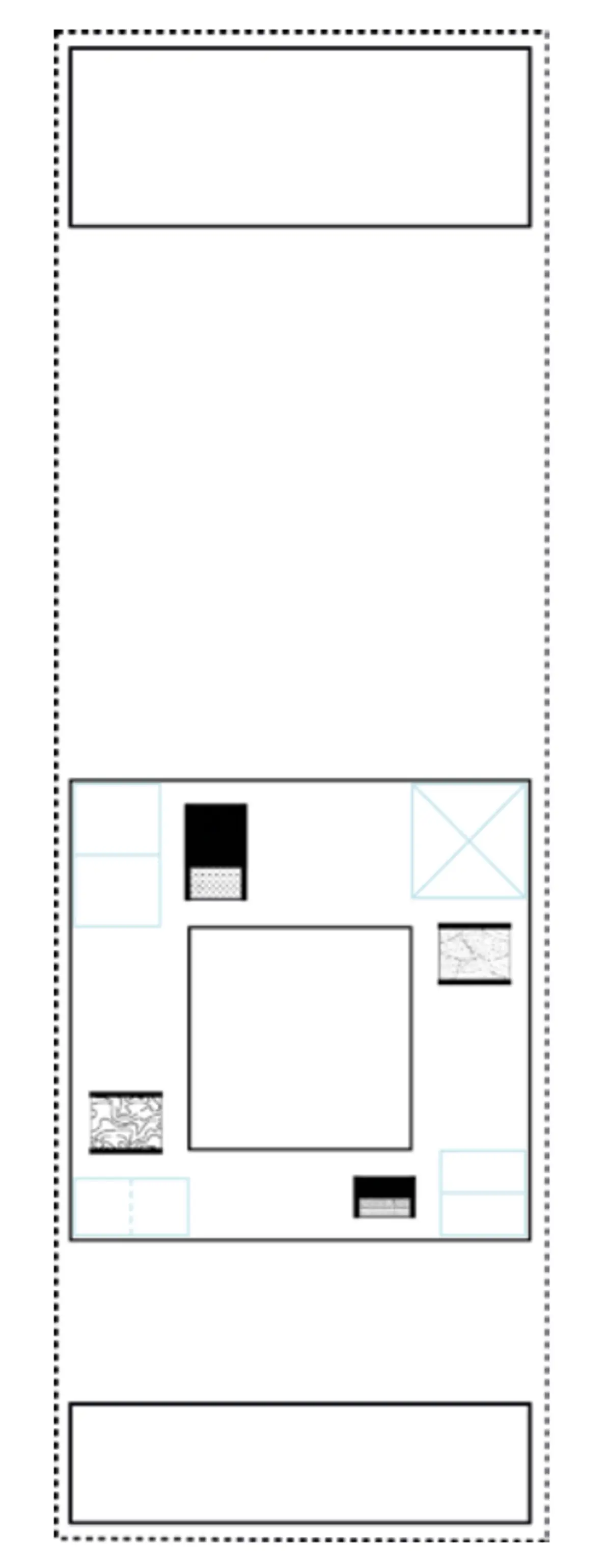 Une disposition urbaine ménage une enceinte coordonnée qui dispose 5 lieux : 3 édifices et 2 jardins. La partie centrale est constituée d’un atrium, de 4 épaisseurs et de 4 points. La variation des épaisseurs s’ajuste au programme flexible et fixe la dimension des points, les services immobiles.