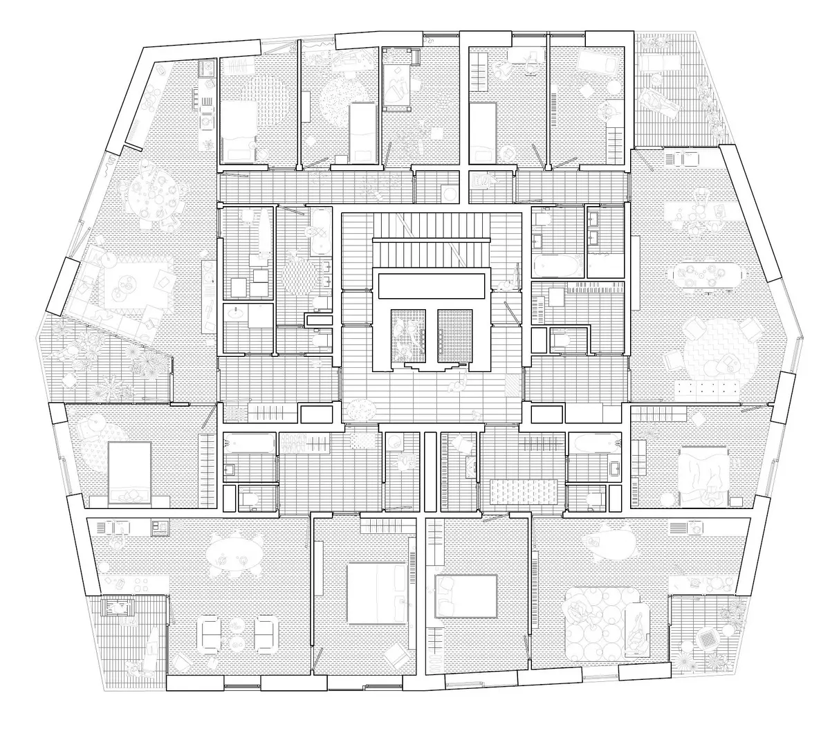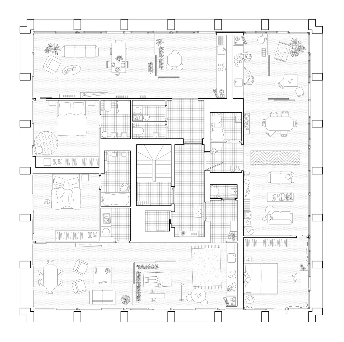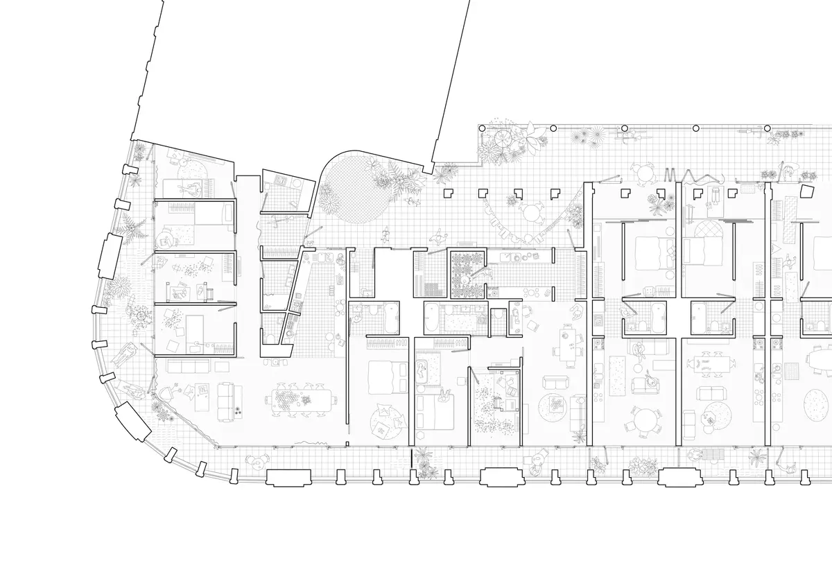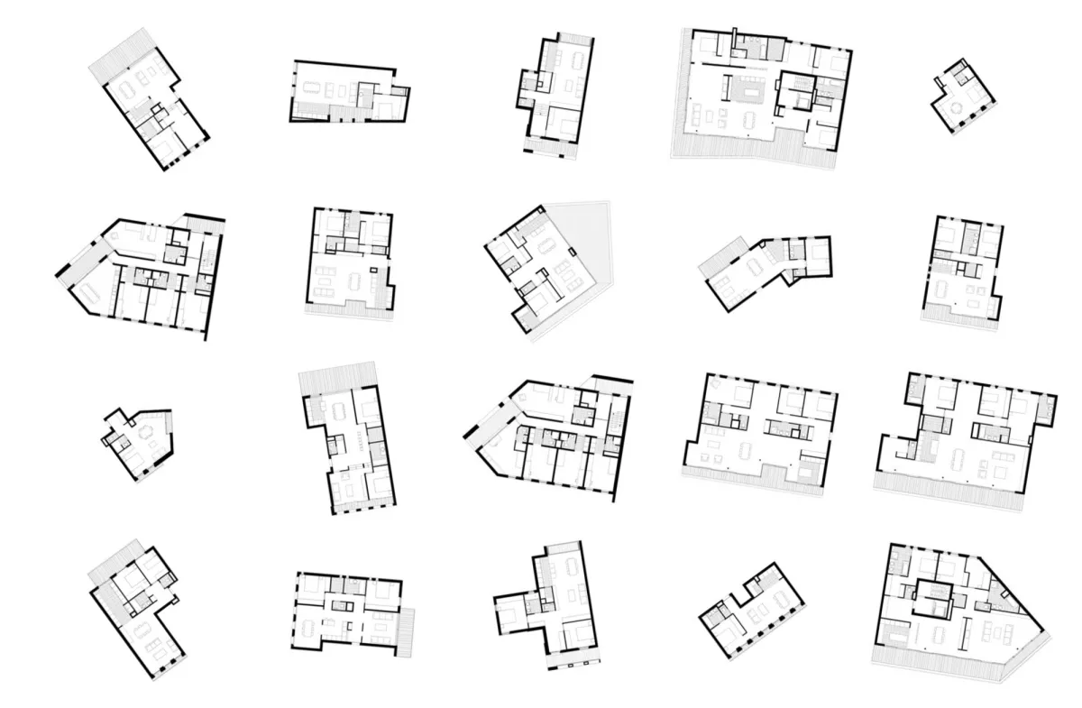 Les appartements s’organisent en trois couches du centre vers la périphérie: les circulations communes, les services, et ensuite les pièces de vie au sens large (salon, cuisines, loggia, chambres,...) qui bénéficient ainsi dee vues sur le paysage lointain.