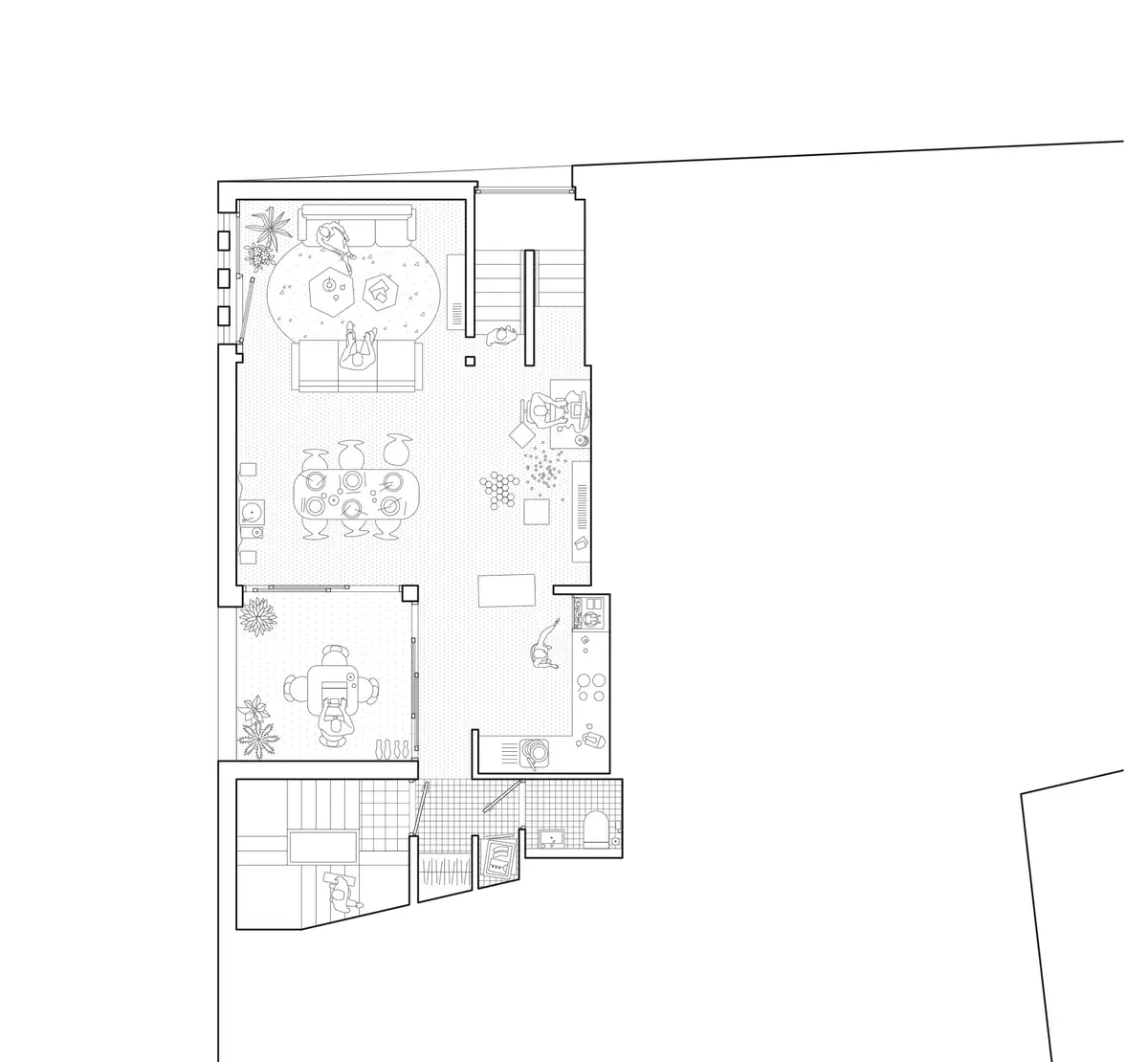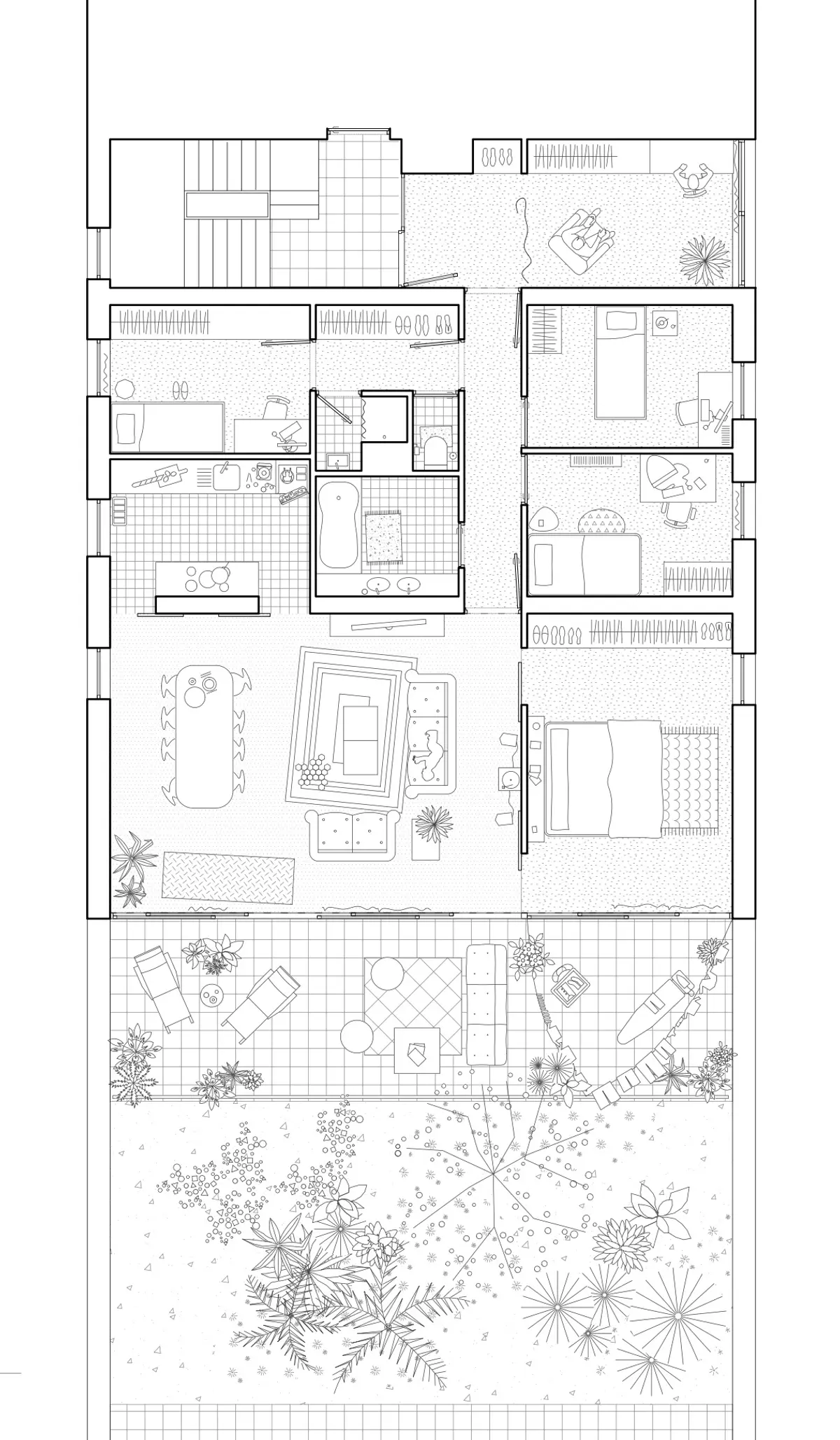 Le projet est organisé en trois couches, les chambres à rue, puis les salons qui s'ouvrent largement sur la nouvelle épaisseur constituée de grandes terrasses ensoleillées et de cuisines, et au loin, un paysage verdoyant.