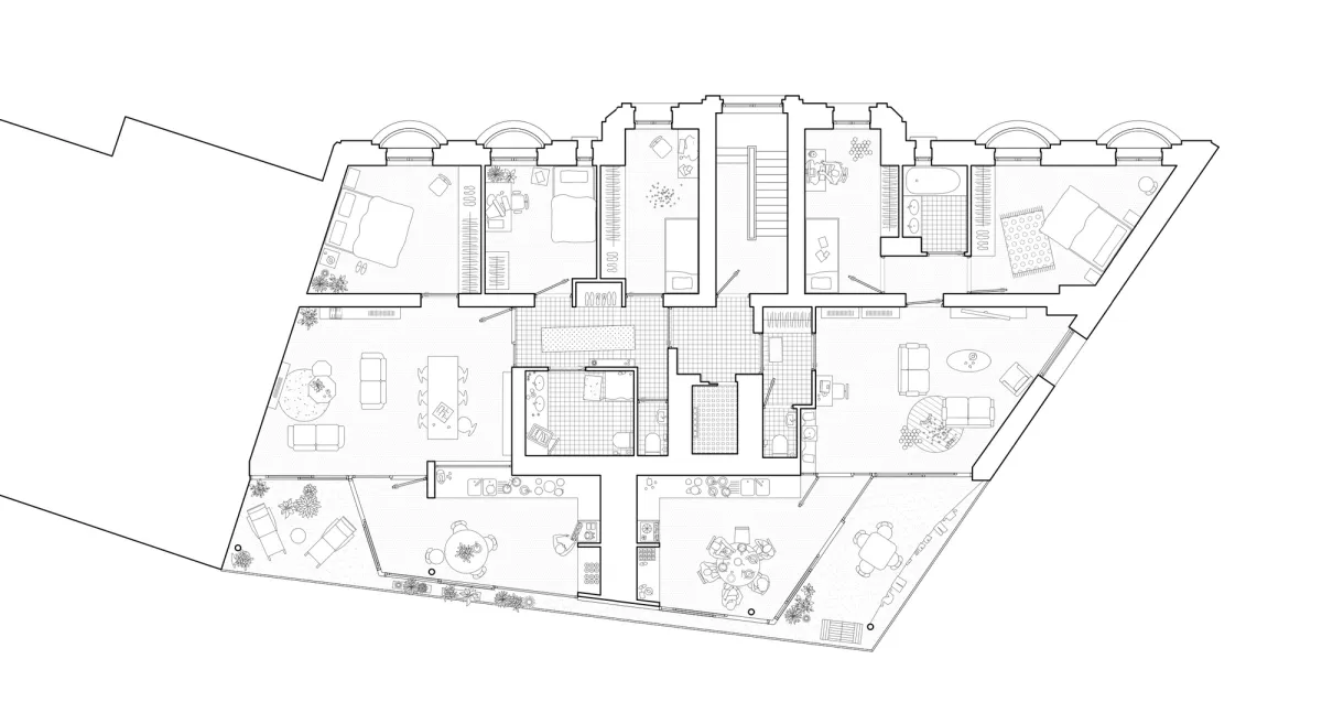 Les appartements s'insèrent entre un nouvel espace public et un jardin, et présentent de multiples typologies qui bénéficient de leur position urbaine particulière : en duplex surplombant un cheminement, au bord d’une double façade donnant sur une place, affublé d’un grand balcon surplombant un jardin …